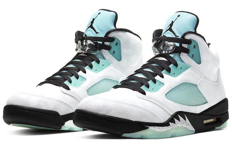 The Nike Air Jordan 5 Retro model gets a chilly ??Island Green?? makeover. The leopard print upper comes in white, while the mesh, tongue and eyestay are in Island Green. Black laces and detailing tie the upper together, underneath is a black midsole with shark teeth detailing and a semi-translucent coat in Island Green.