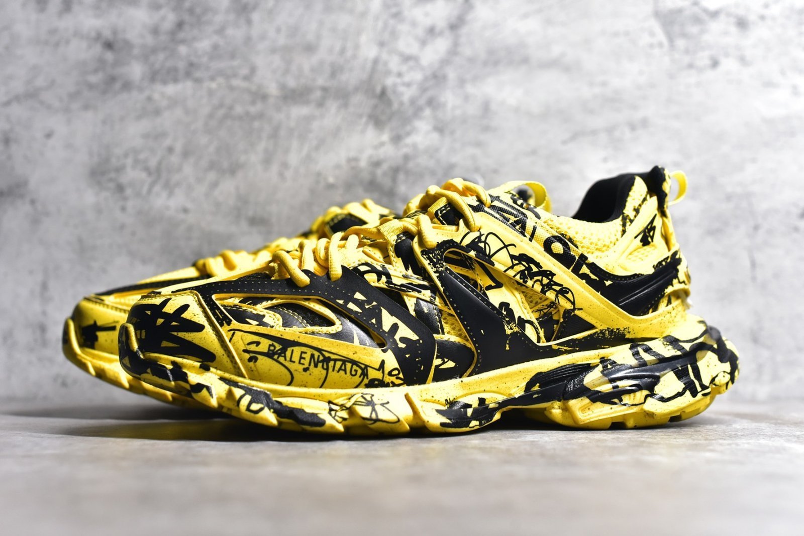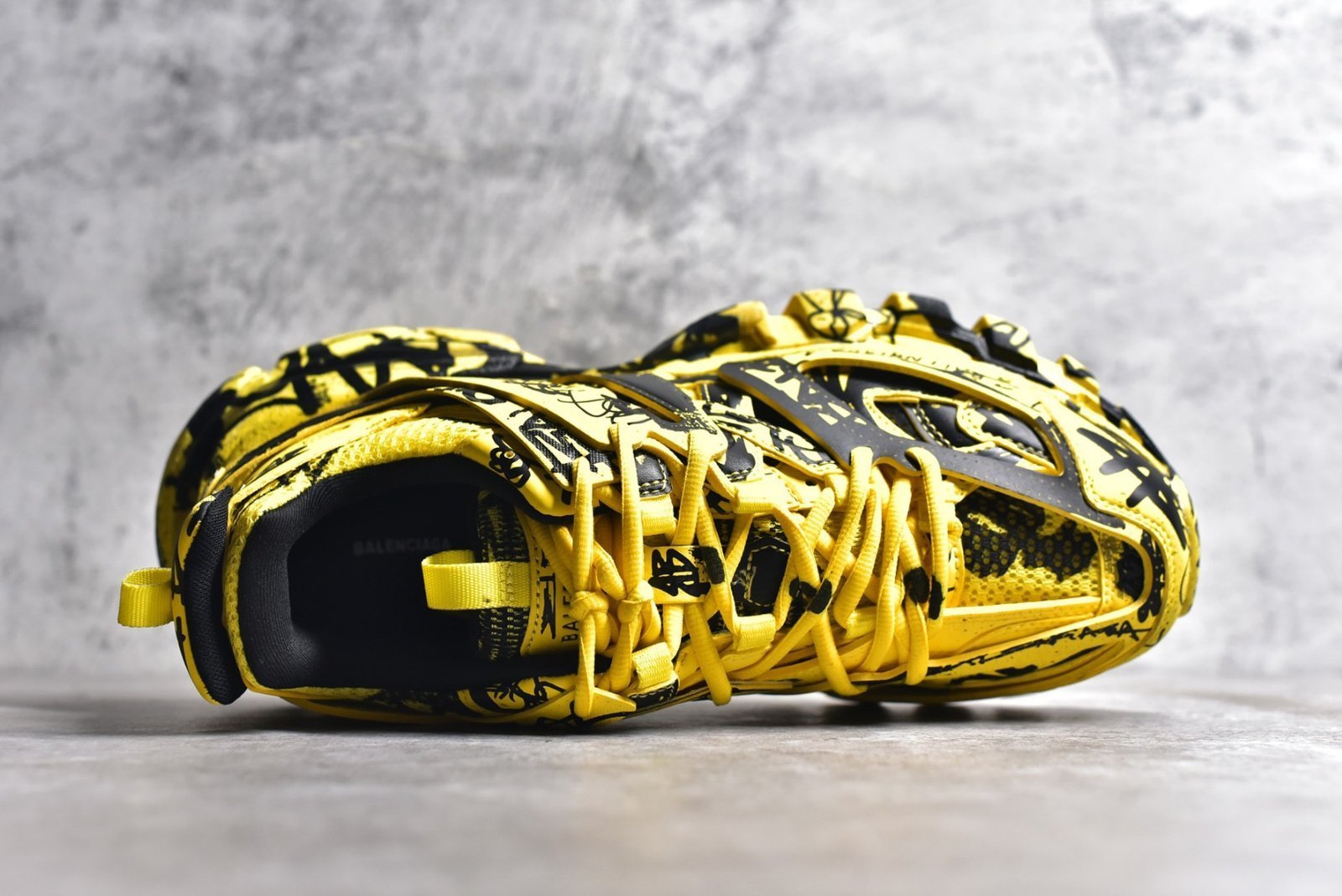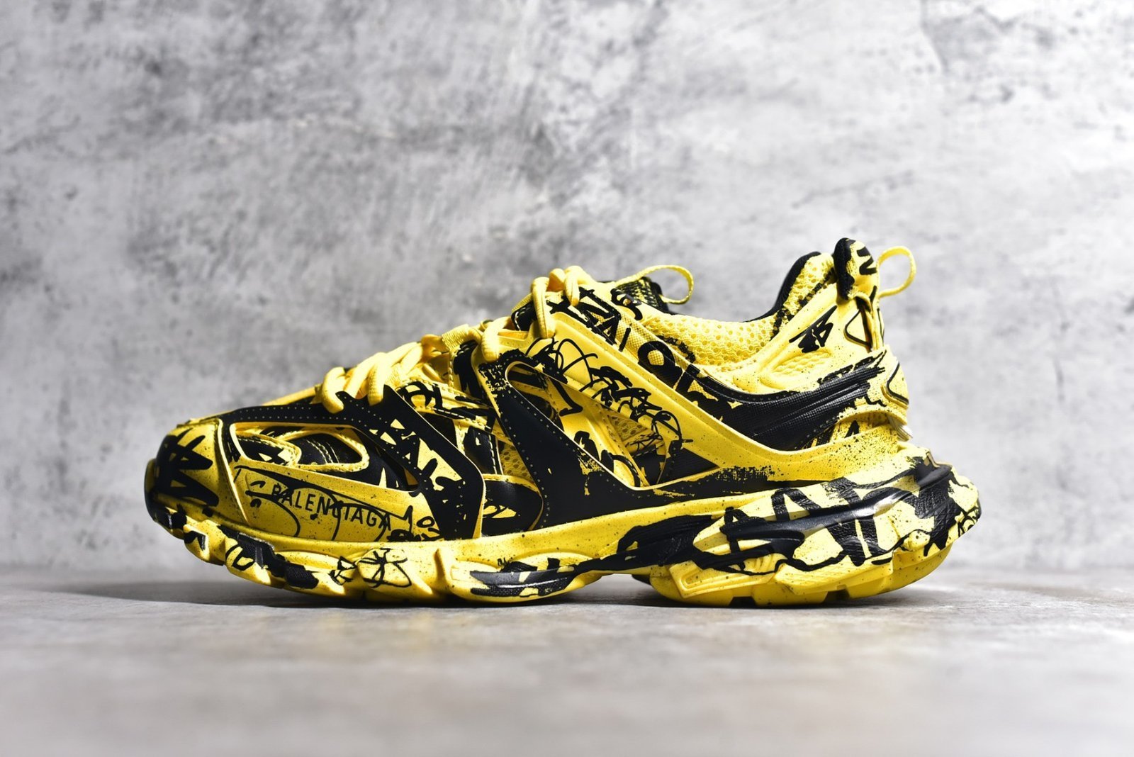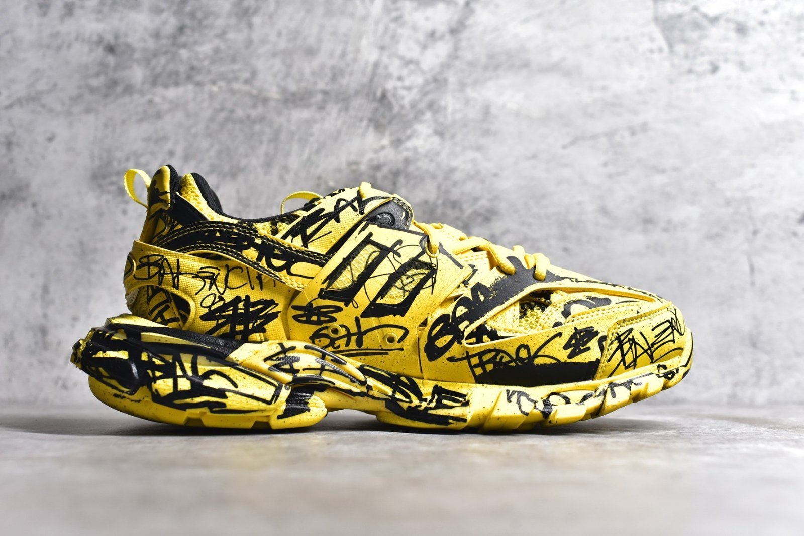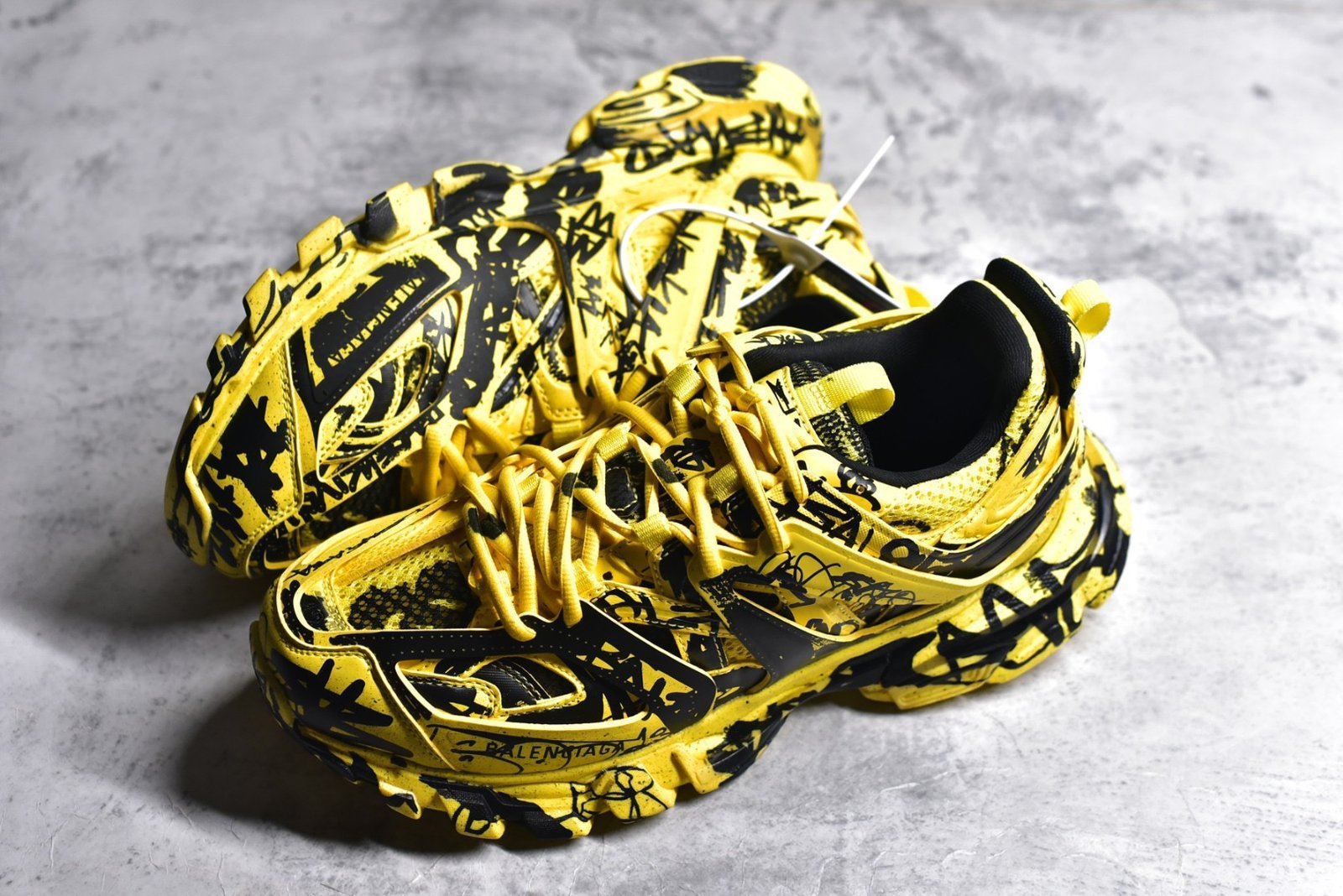 The Balenciaga Track Sneaker Graffiti offers a bold fusion of street art and high-performance design. These sneakers stand out with their graffiti-style graphics. adding a dynamic and artistic touch to the multi-layered upper. Crafted from a mix of mesh. leather. and synthetic materials. these sneakers ensure durability. breathability. and a lightweight feel. The intricate paneling and overlays create a textured. eye-catching look. while the padded collar and tongue enhance comfort. The lace-up closure provides a secure fit. and reflective accents improve visibility. The exaggerated. chunky sole delivers superior cushioning and support. making these sneakers ideal for various activities. Subtle Balenciaga branding on the side and tongue completes the edgy. contemporary aesthetic. Perfect for those who appreciate a blend of artistic expression and modern sneaker design. the Balenciaga Track Sneaker Graffiti is a statement piece for any footwear collection.