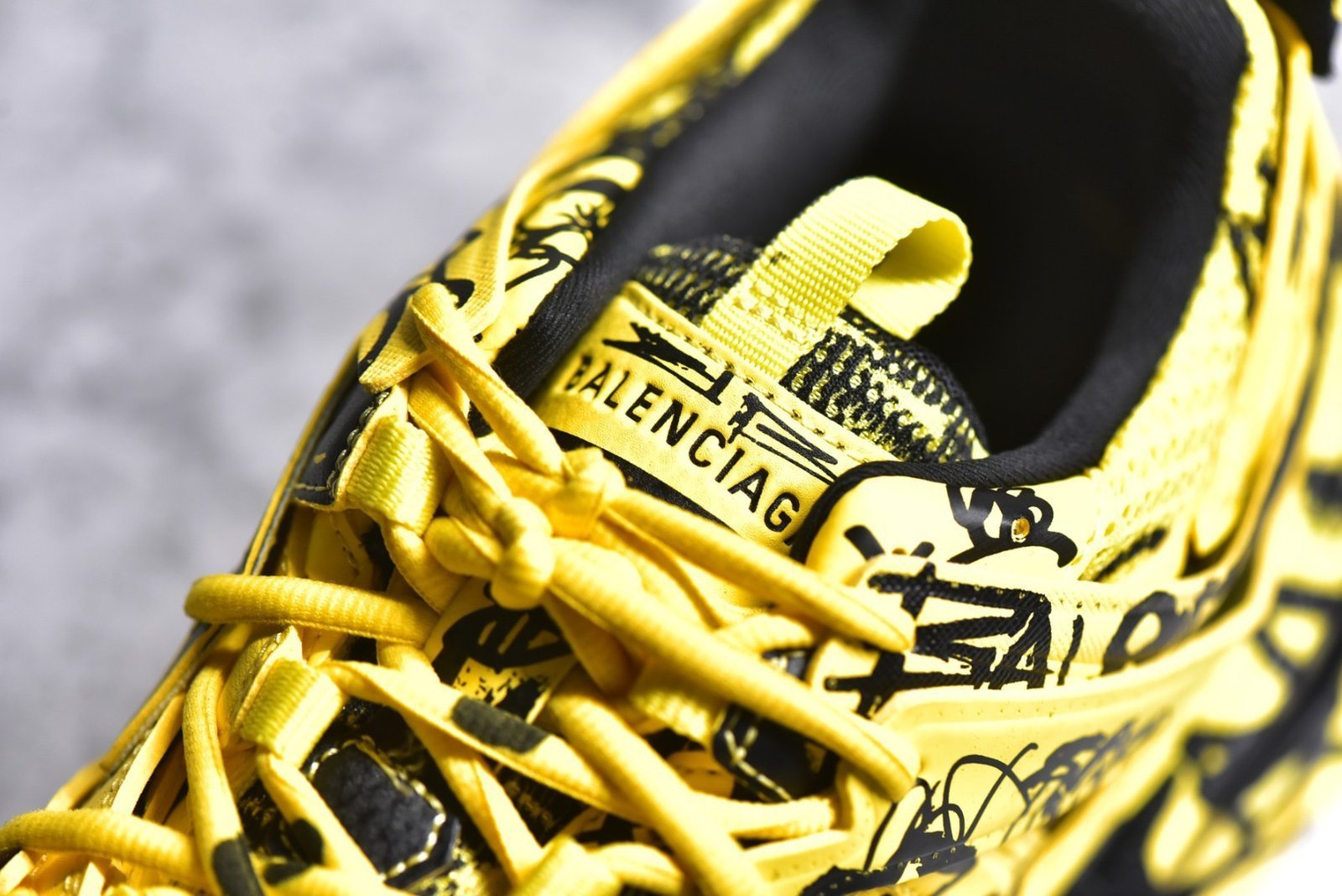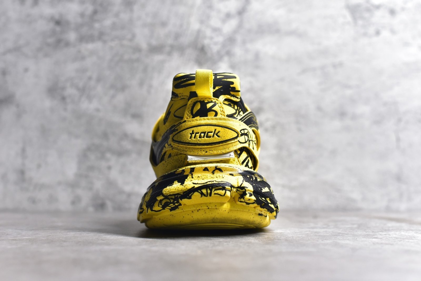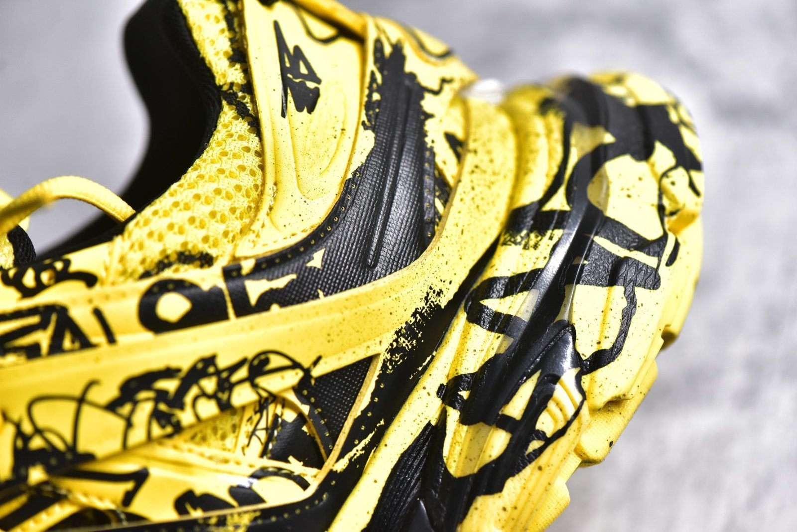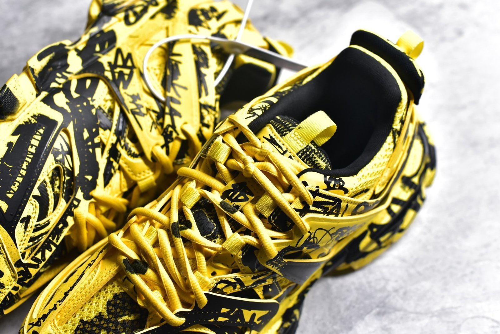 The Balenciaga Track Sneaker Graffiti offers a bold fusion of street art and high-performance design. These sneakers stand out with their graffiti-style graphics. adding a dynamic and artistic touch to the multi-layered upper. Crafted from a mix of mesh. leather. and synthetic materials. these sneakers ensure durability. breathability. and a lightweight feel. The intricate paneling and overlays create a textured. eye-catching look. while the padded collar and tongue enhance comfort. The lace-up closure provides a secure fit. and reflective accents improve visibility. The exaggerated. chunky sole delivers superior cushioning and support. making these sneakers ideal for various activities. Subtle Balenciaga branding on the side and tongue completes the edgy. contemporary aesthetic. Perfect for those who appreciate a blend of artistic expression and modern sneaker design. the Balenciaga Track Sneaker Graffiti is a statement piece for any footwear collection.