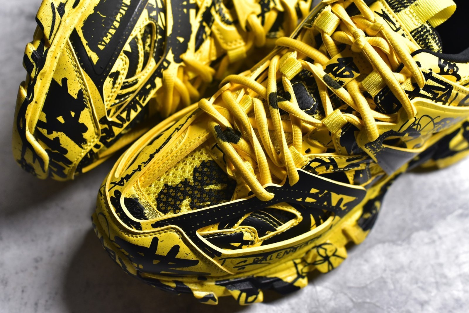 The Balenciaga Track Sneaker Graffiti combines street art-inspired design with high-performance features. including a mix of mesh and leather. graffiti graphics. and a chunky sole for cushioning and style. Perfect for those who love bold and contemporary footwear.