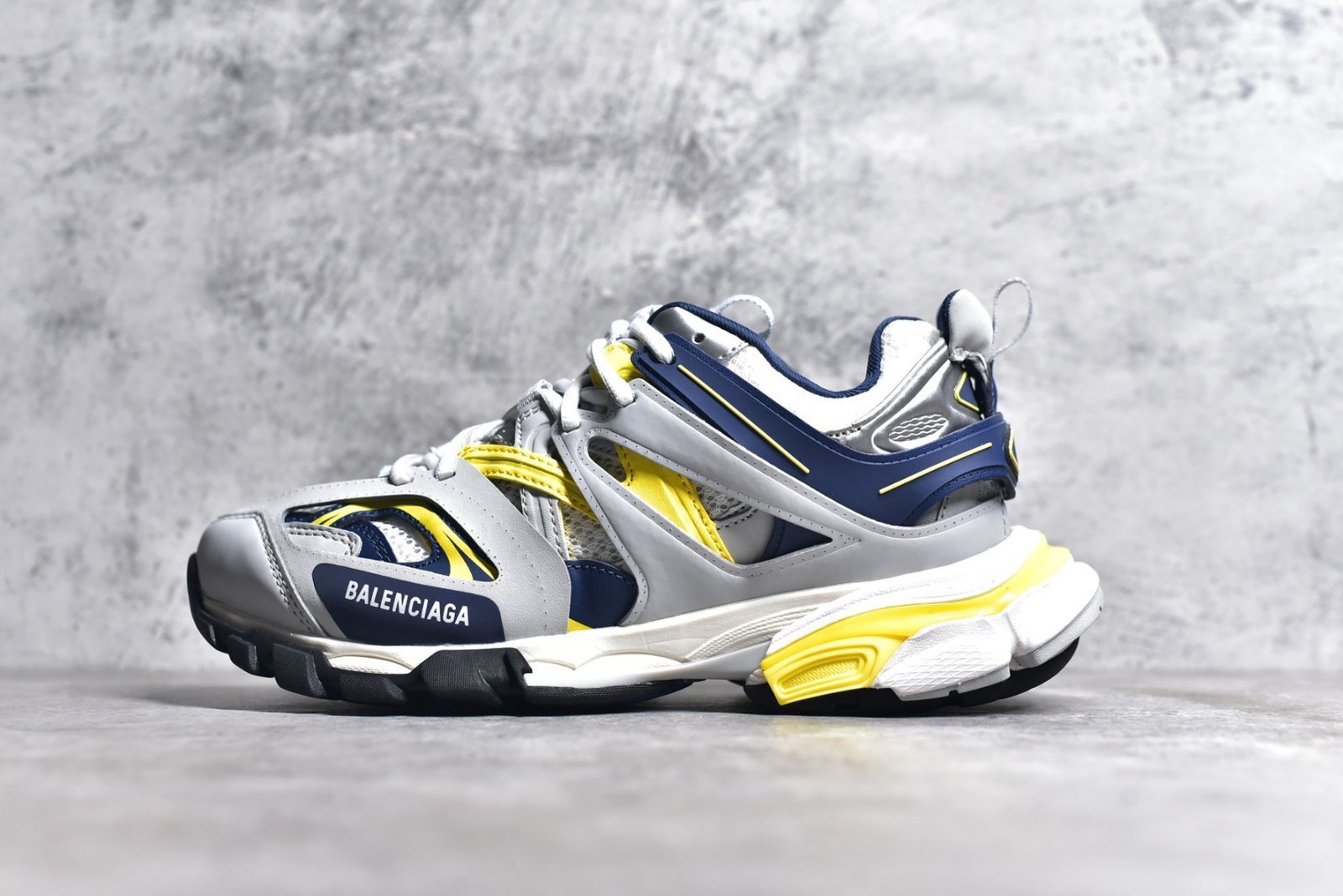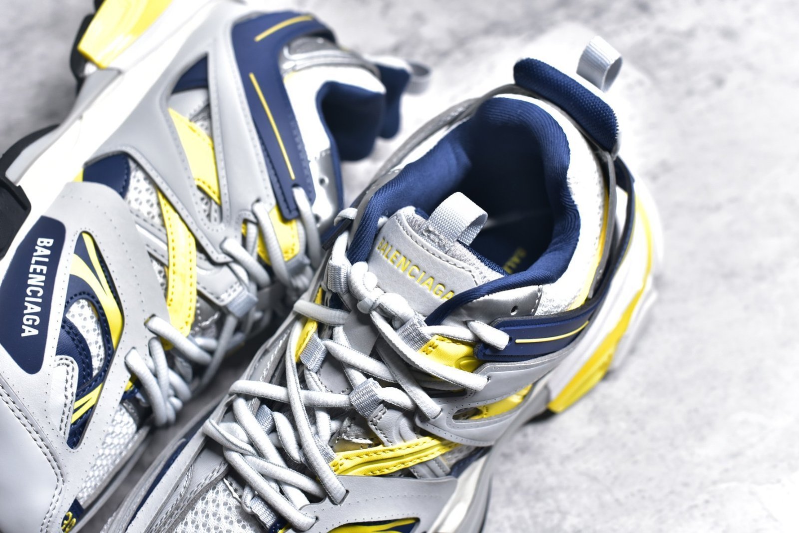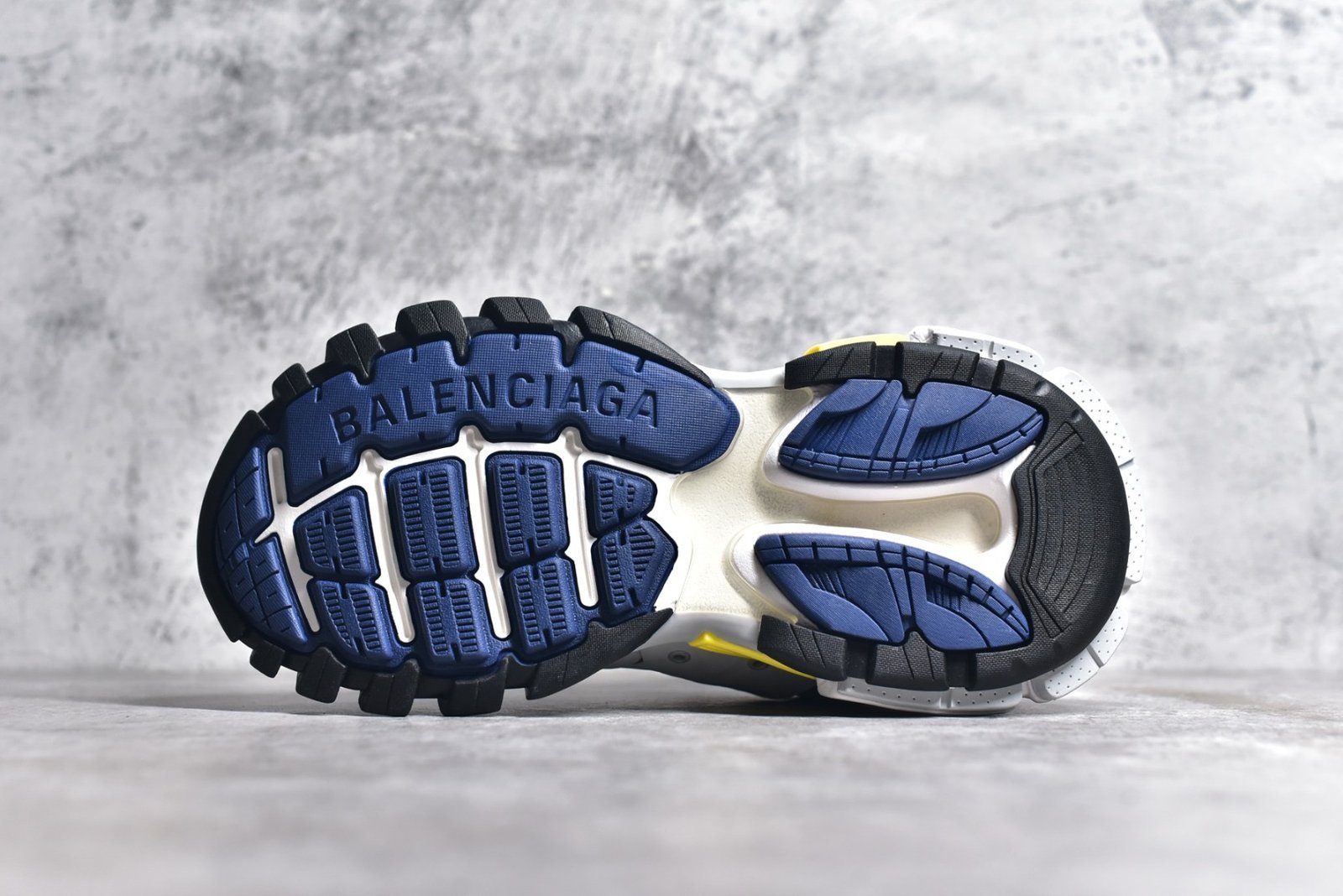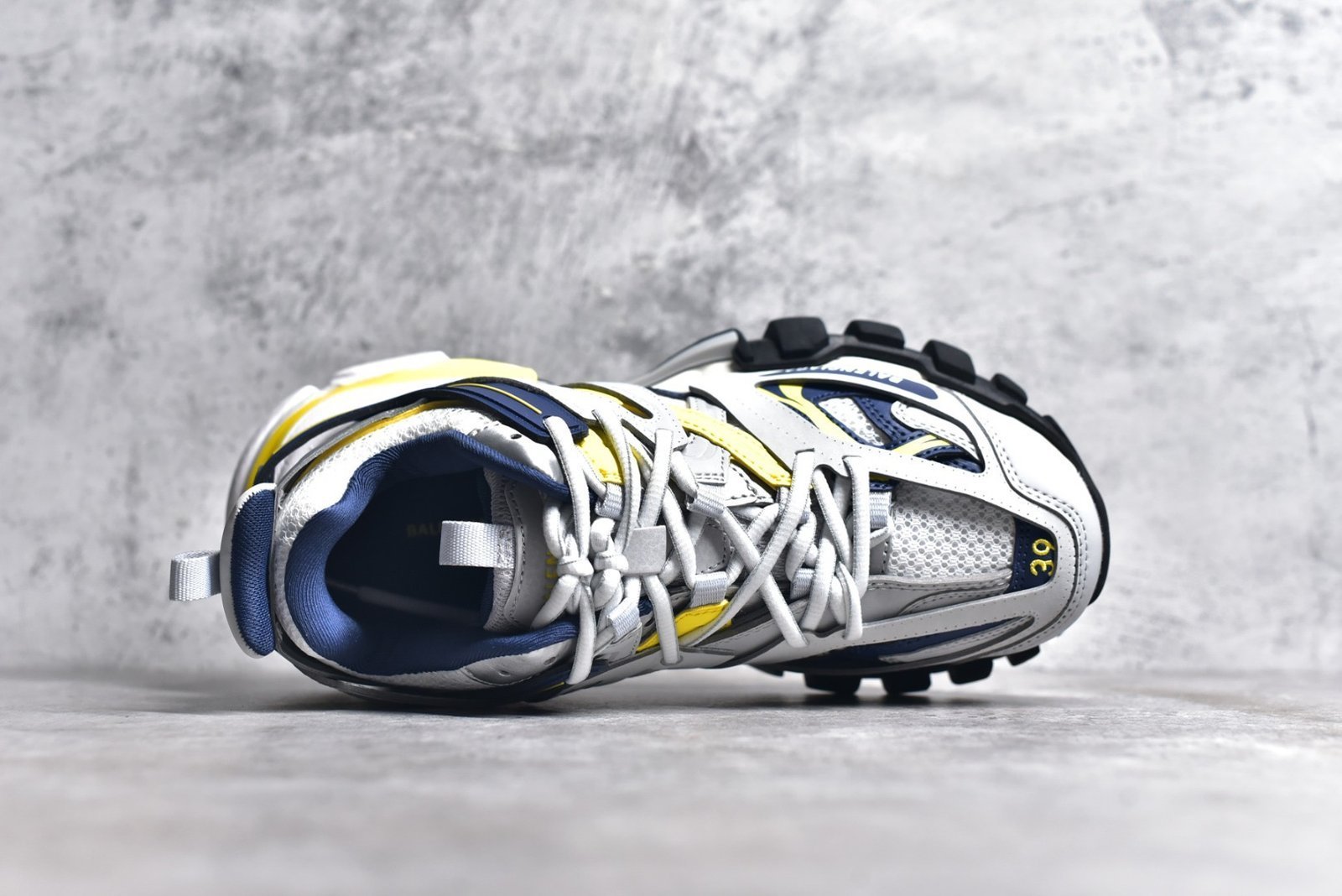 The Balenciaga Track Sneaker in White Navy combines innovative design with athletic functionality. These sneakers feature a dynamic colorway of white and navy. crafted from a mix of mesh and synthetic materials for durability and breathability. The multi-panel upper includes overlays and mesh insets. creating a layered and textured look. A padded collar and tongue enhance comfort. while the lace-up closure ensures a secure fit. The sneakers are equipped with a chunky. dual-density sole for superior cushioning and traction. ideal for various terrains. Reflective accents on the heel and toe add visibility. while the Balenciaga branding on the side completes the modern aesthetic. Elevate your footwear collection with the Balenciaga Track Sneaker in White Navy. designed for both style and performance.