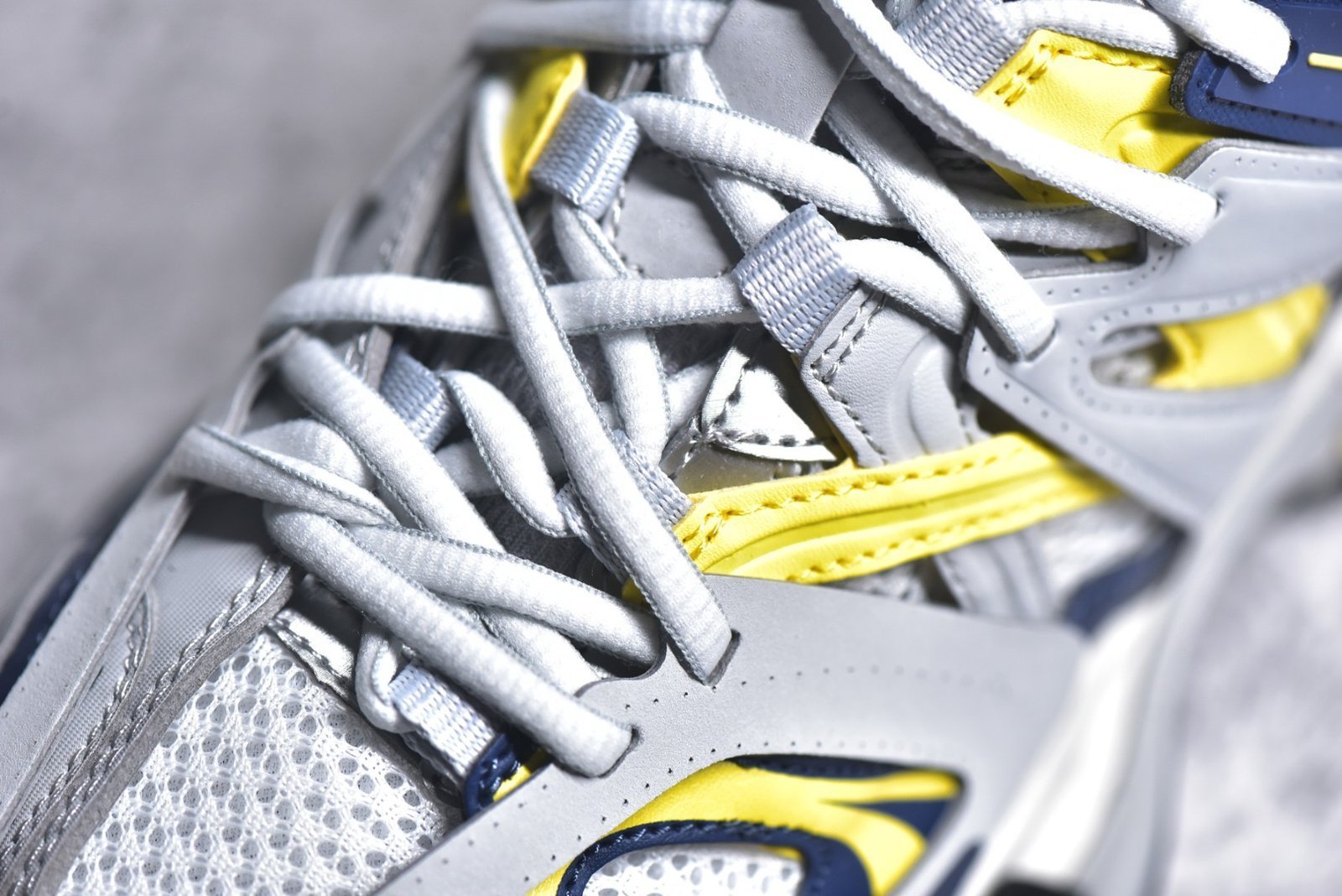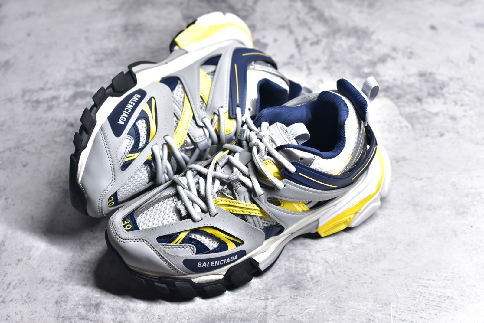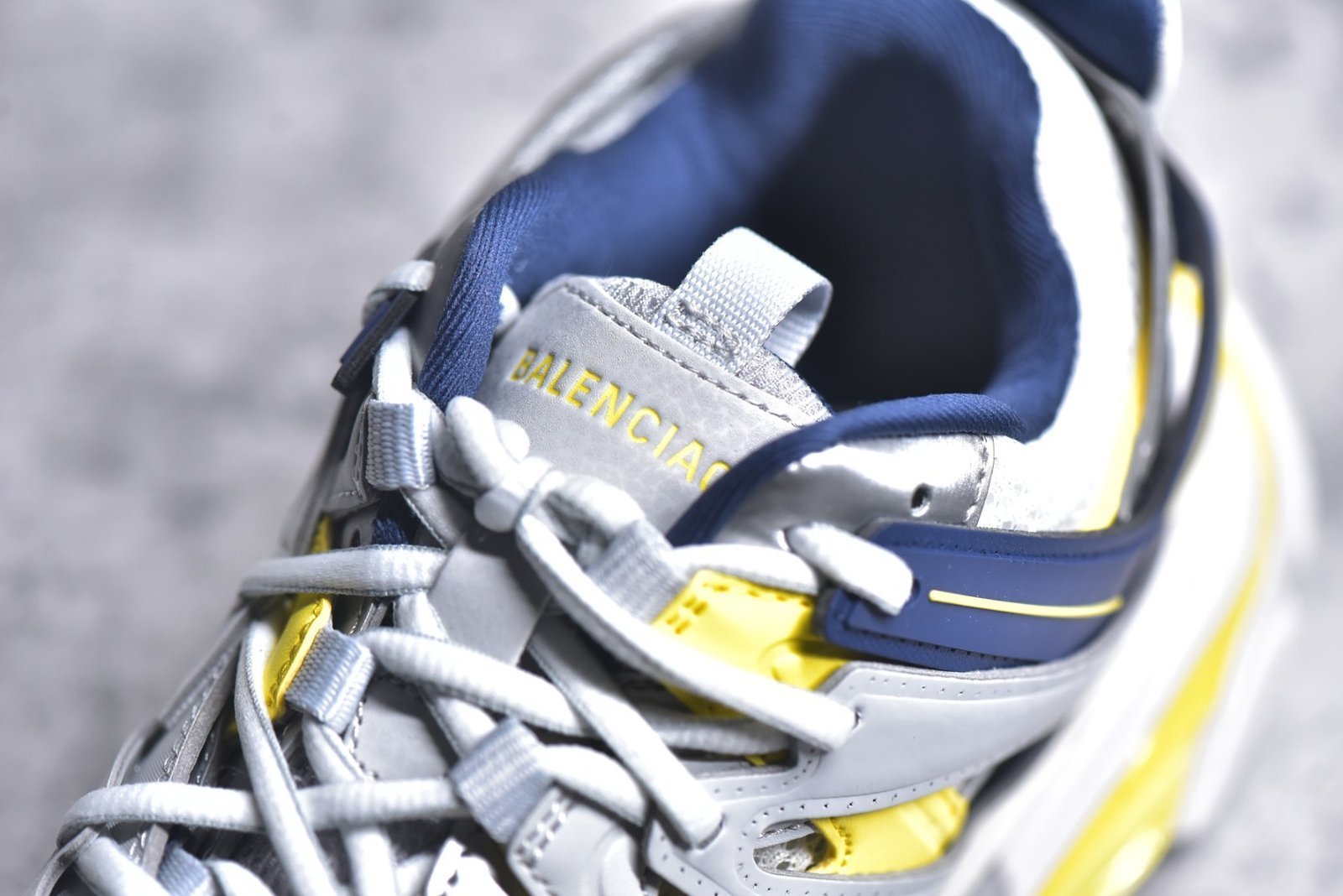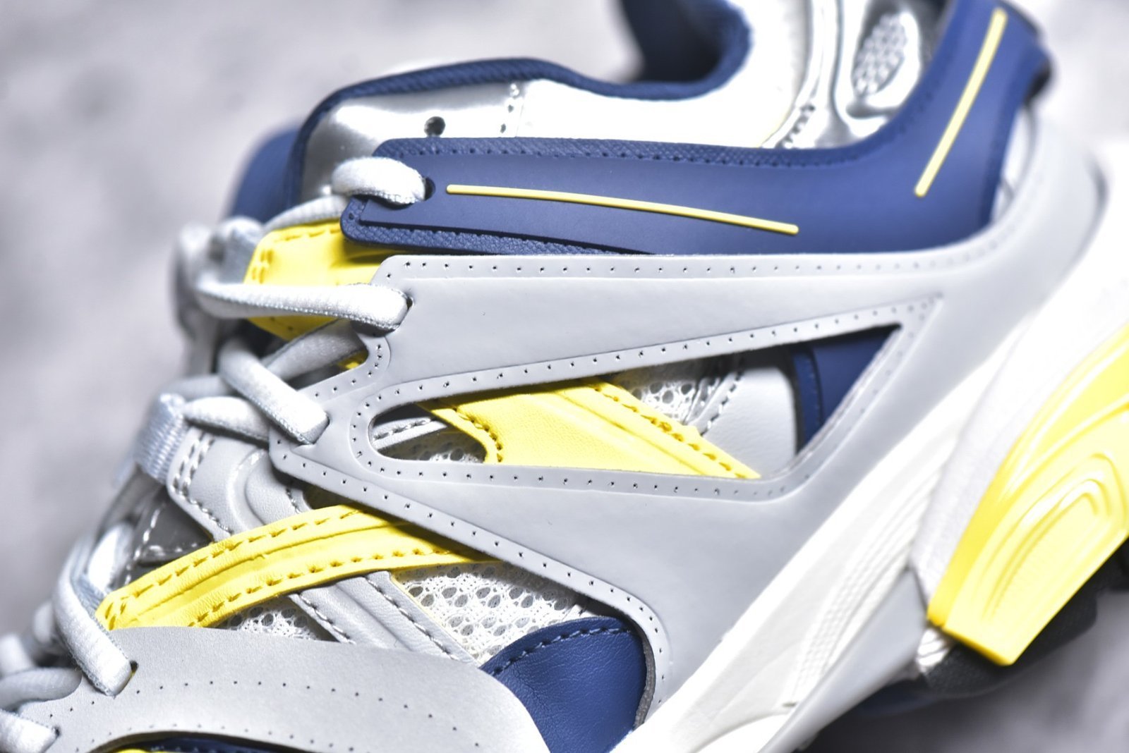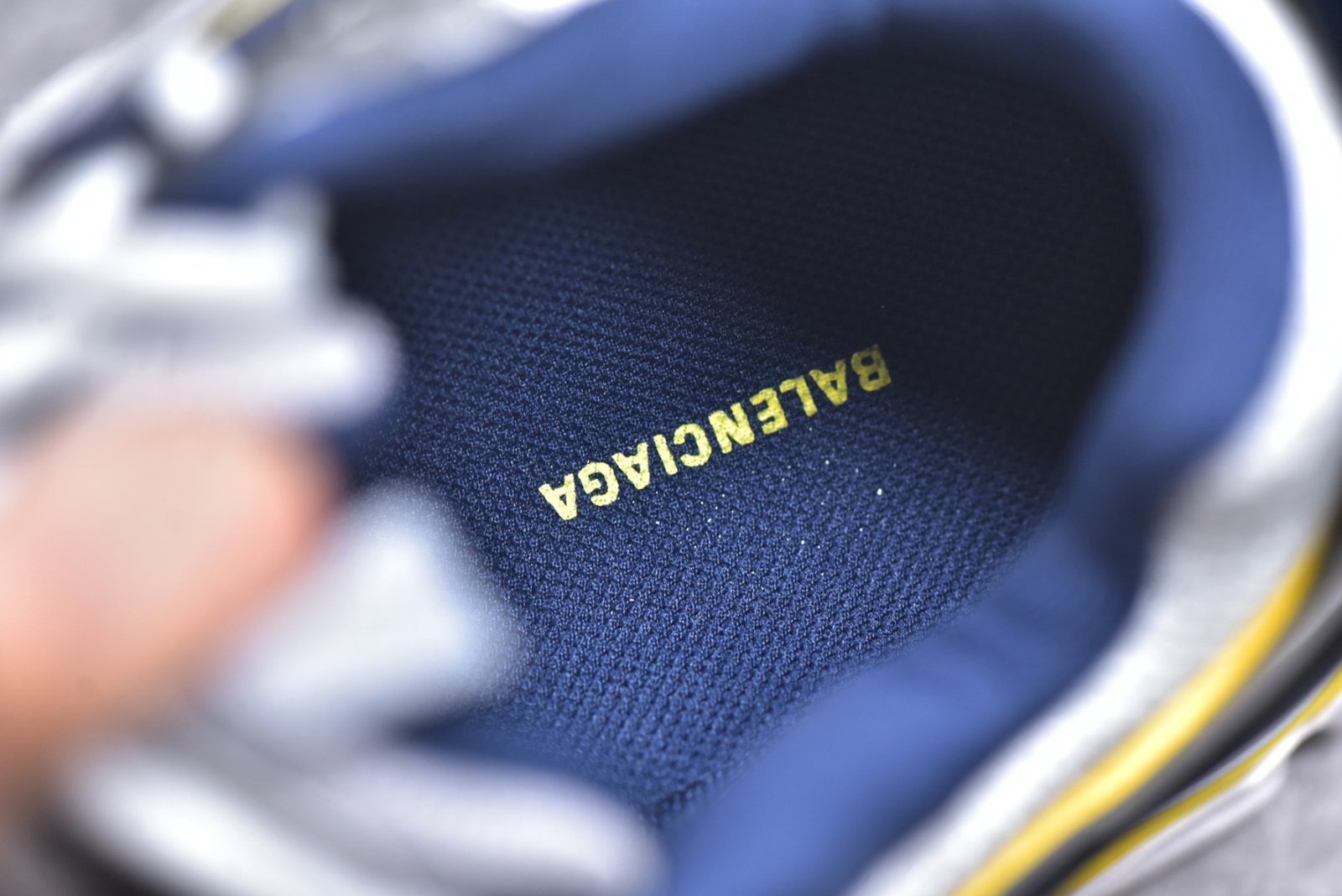The Balenciaga Track Sneaker in White Navy combines innovative design with athletic functionality. These sneakers feature a dynamic colorway of white and navy. crafted from a mix of mesh and synthetic materials for durability and breathability. The multi-panel upper includes overlays and mesh insets. creating a layered and textured look. A padded collar and tongue enhance comfort. while the lace-up closure ensures a secure fit. The sneakers are equipped with a chunky. dual-density sole for superior cushioning and traction. ideal for various terrains. Reflective accents on the heel and toe add visibility. while the Balenciaga branding on the side completes the modern aesthetic. Elevate your footwear collection with the Balenciaga Track Sneaker in White Navy. designed for both style and performance.
