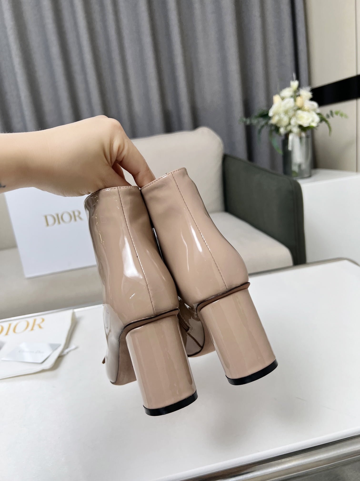 Dior 2023 autumn and winter new nude boots. the outside of the upper whole piece of soft patent leather constantly open. simple atmosphere. 🌹🌹🌹 with brand classic vintage hardware buckle. Patent leather mirror upper with 7.5cm heel height. ultra leg length. Can let you second change no problem temperament goddess 👄💗👄 Yang Jing color later