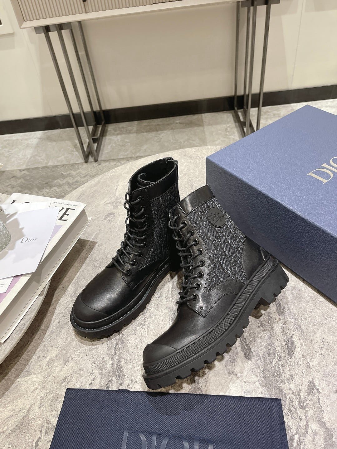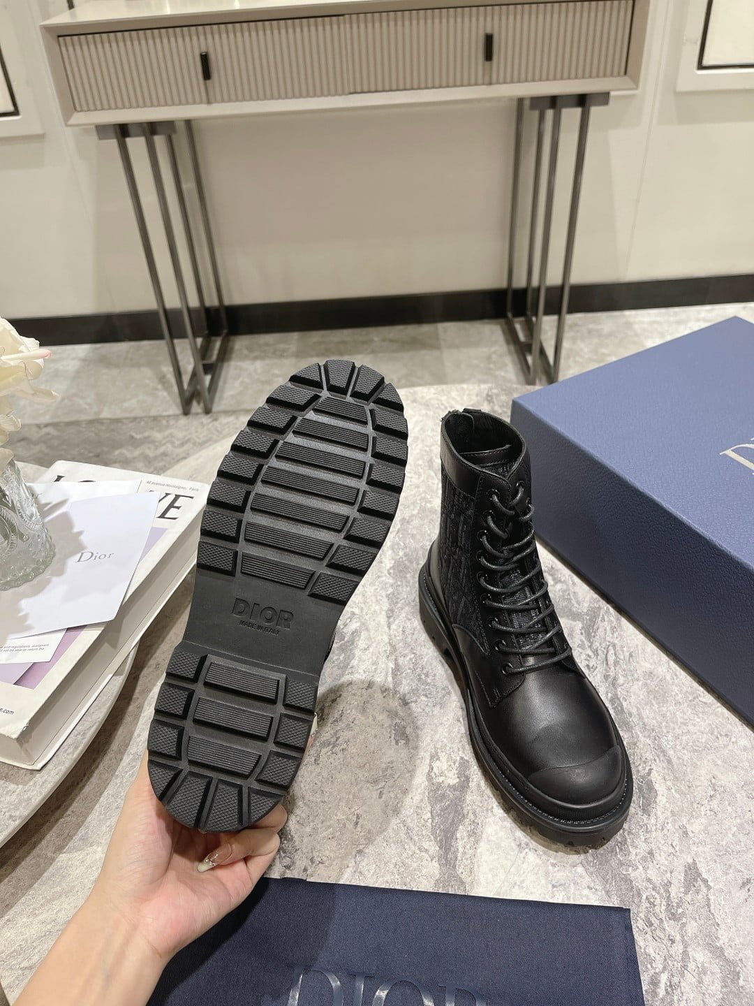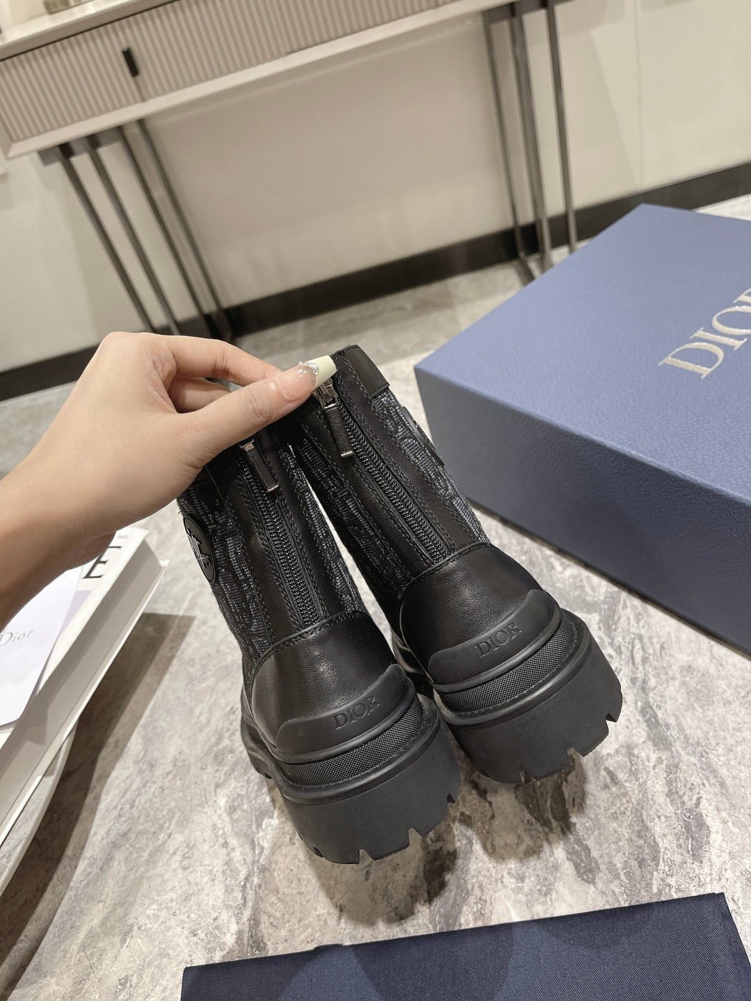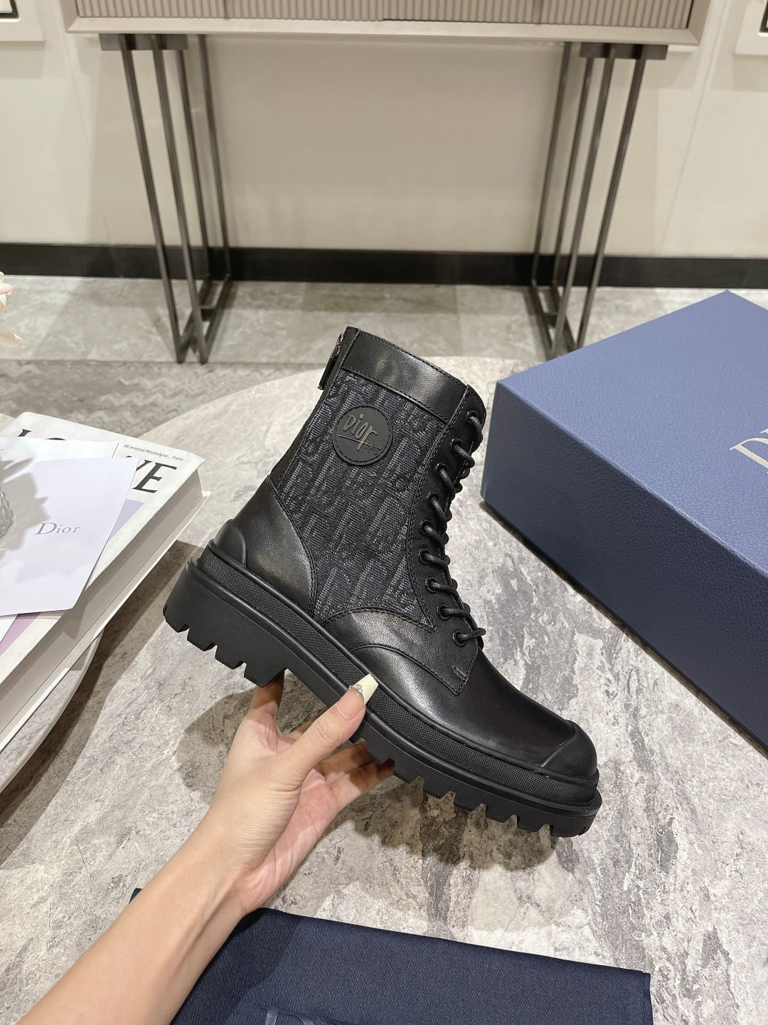 The Dior Ex lorer ankle-length boots are crafted in black smooth cow leather with a beige and black Oblique print stitching on both sides. With sheep leather full lining material. create a comfortable wearing experience. The rear zipper opens and closes for easy wearing and removing. Decorated with DIOR logo patches. with notched rubber soles and reinforced rubber toe in the same color. more sophisticated. It can be paired with various pieces of the season for a stylish look. With the exquisite packaging of the counter 🛍📦