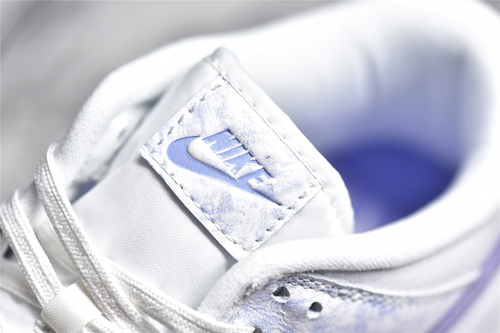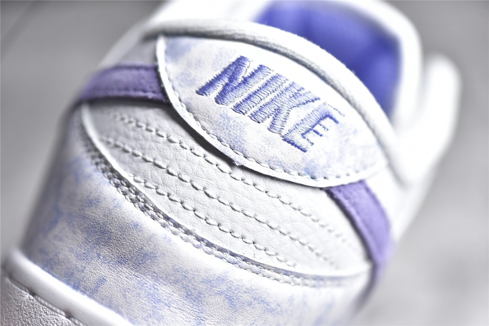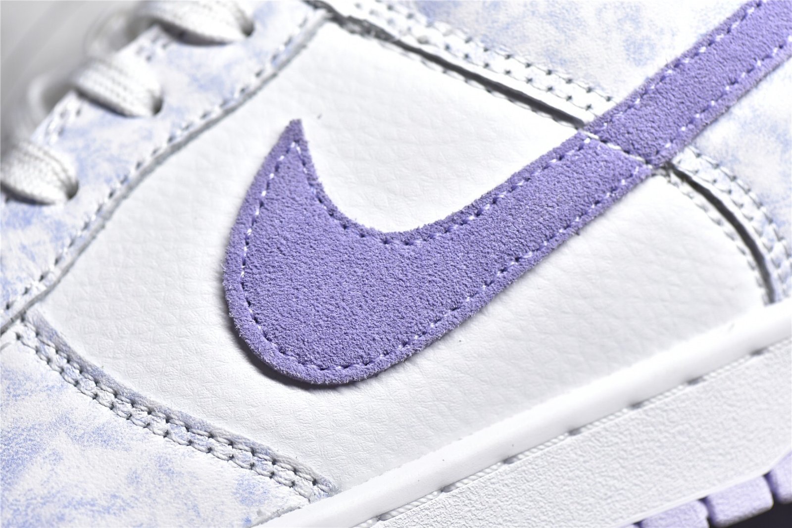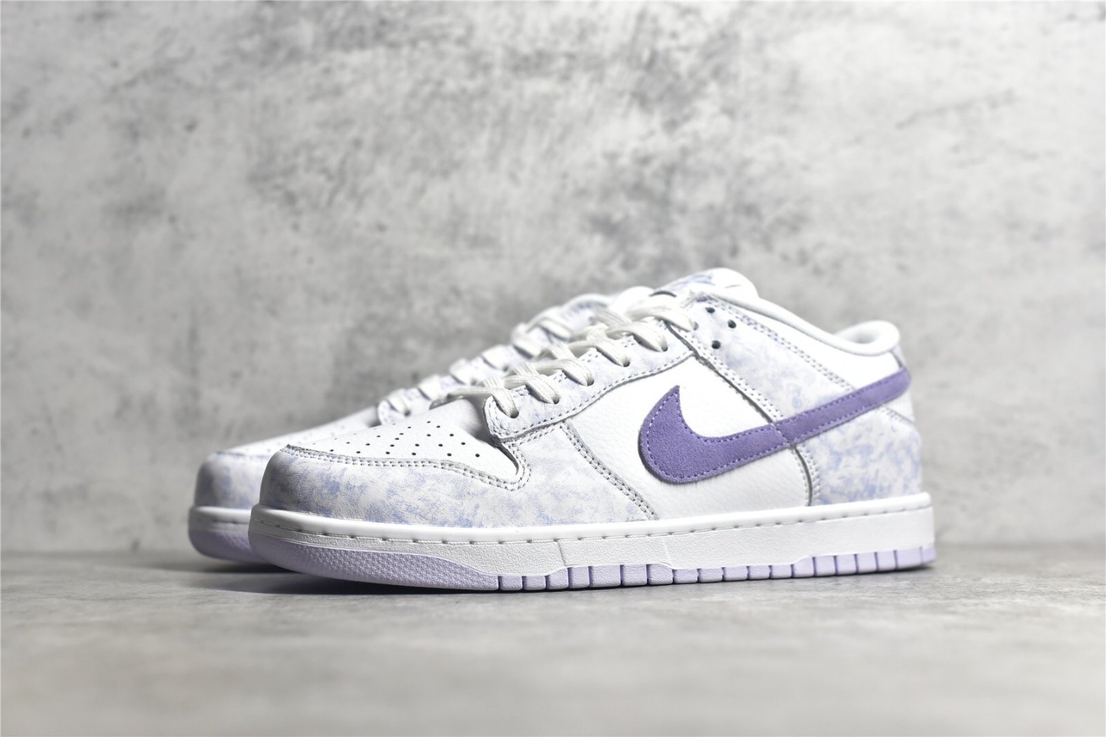 - Design Elements: Features a tie-dye-like pattern on the purple suede overlays and a white leather base. The Nike Swoosh is also in white. providing a clean contrast. The sneaker includes a unique design with subtle details like a speckled midsole and purple accents on the tongue and heel tab.