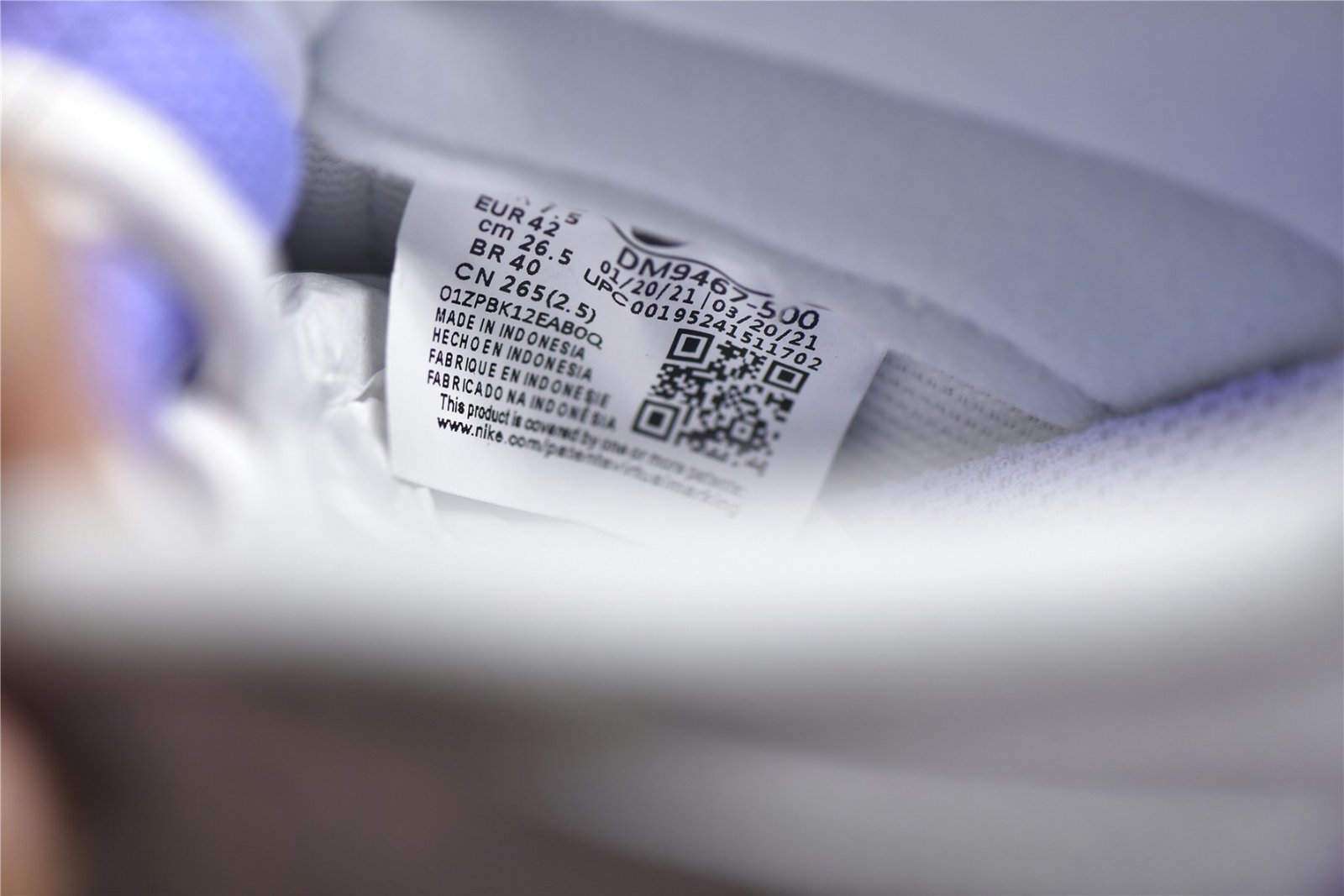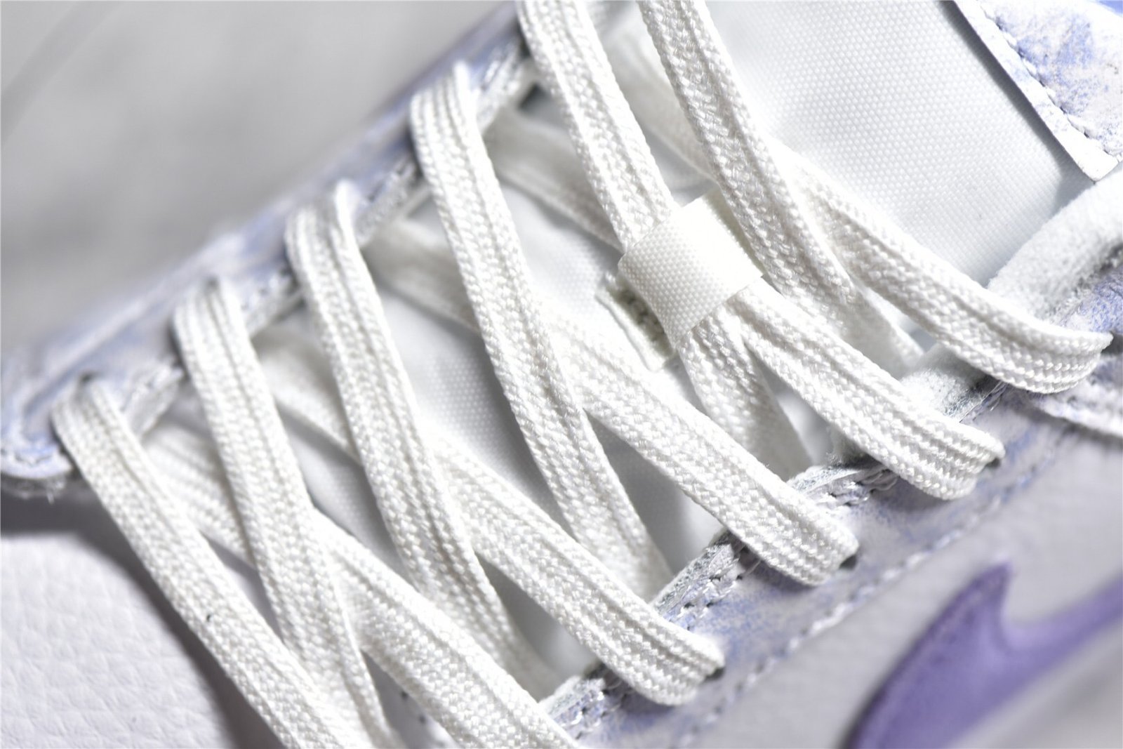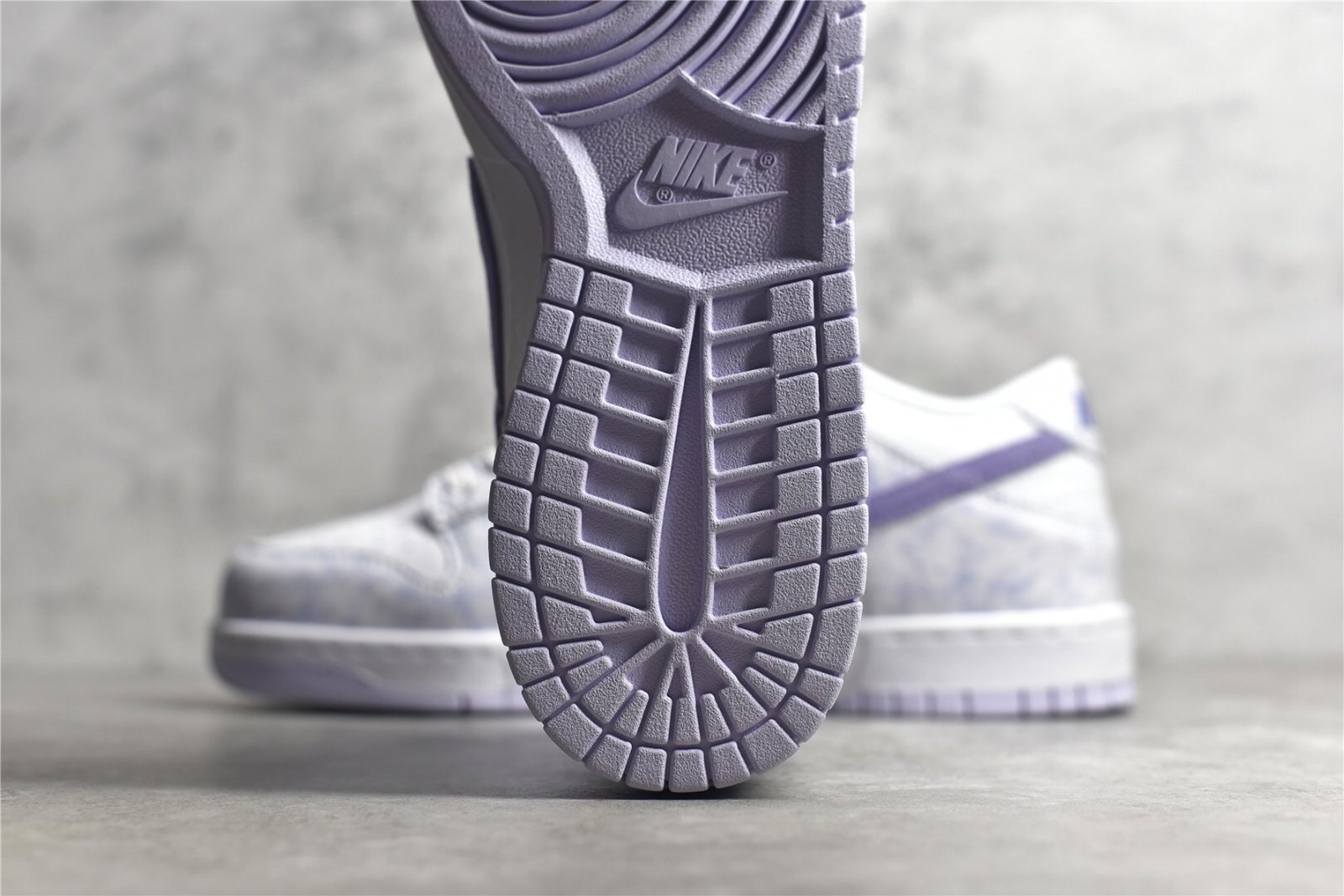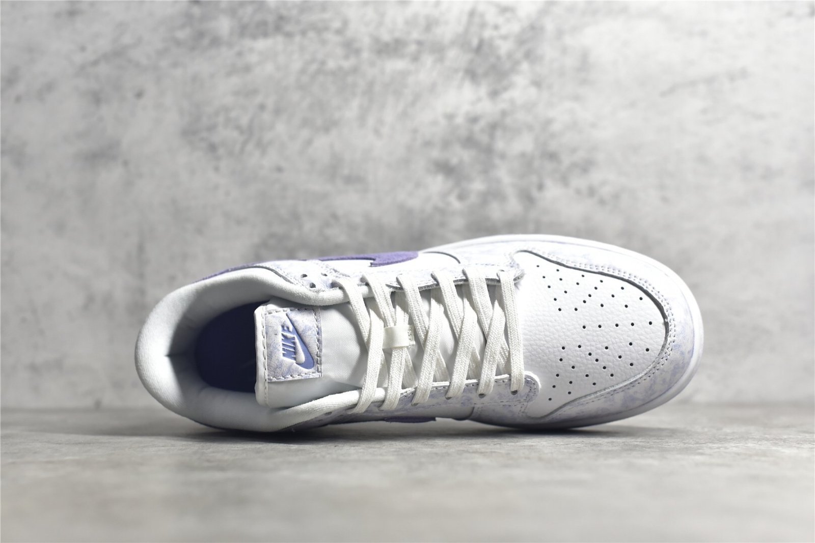 - Design Elements: Features a tie-dye-like pattern on the purple suede overlays and a white leather base. The Nike Swoosh is also in white. providing a clean contrast. The sneaker includes a unique design with subtle details like a speckled midsole and purple accents on the tongue and heel tab.
