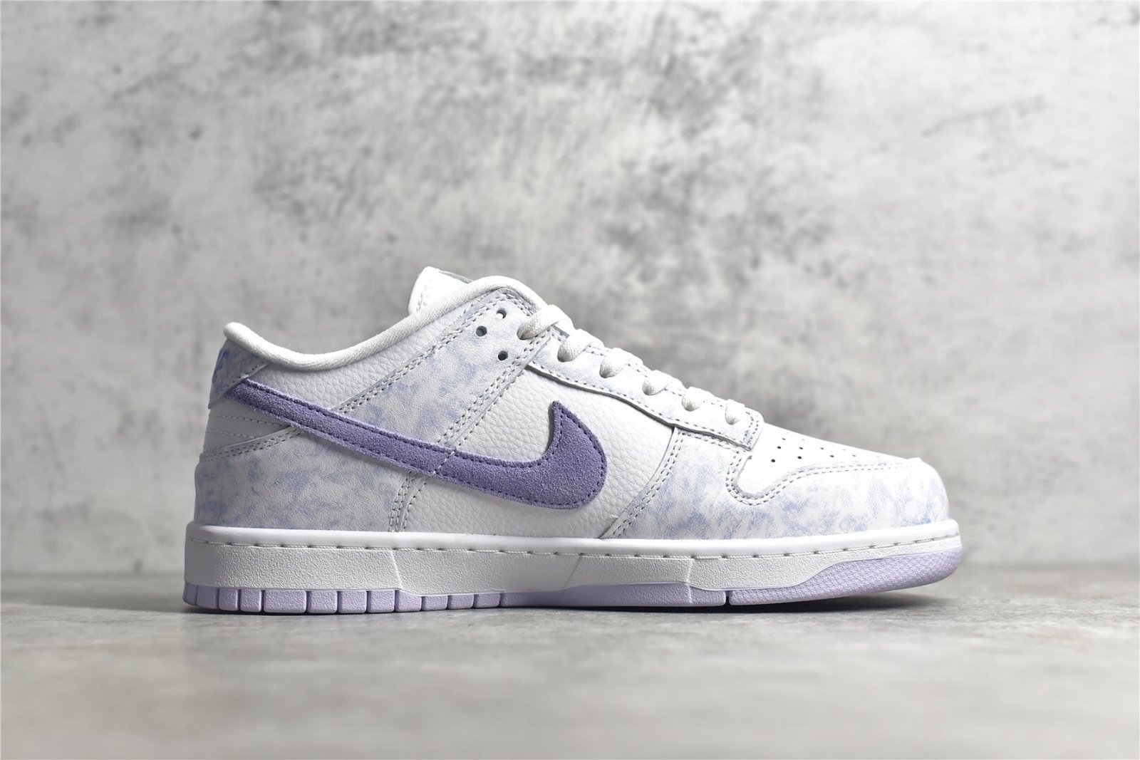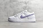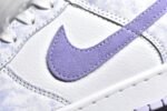 The Dunk Low Purple Pulse DM9467-500 features a tie-dye-inspired purple suede overlay on a white leather base. complemented by a white Nike Swoosh. This sneaker includes a speckled midsole and purple accents on the tongue and heel tab. It offers a padded tongue and collar. traditional foam midsole. and durable rubber outsole for comfort and performance.