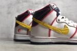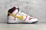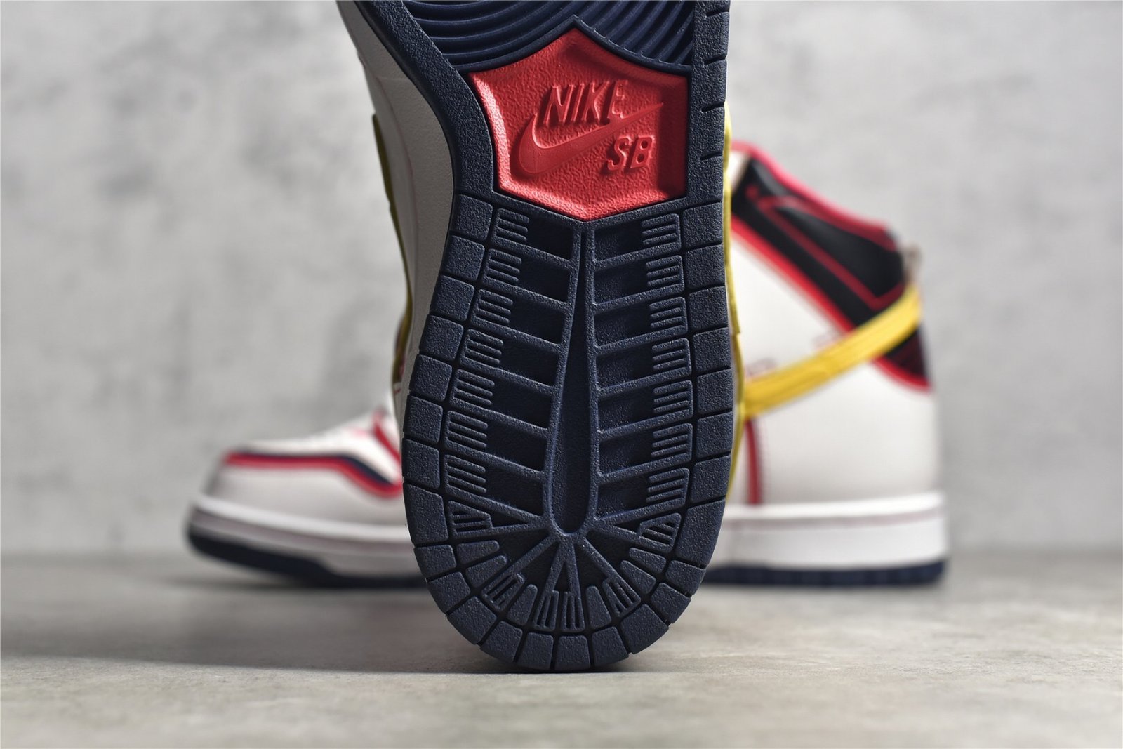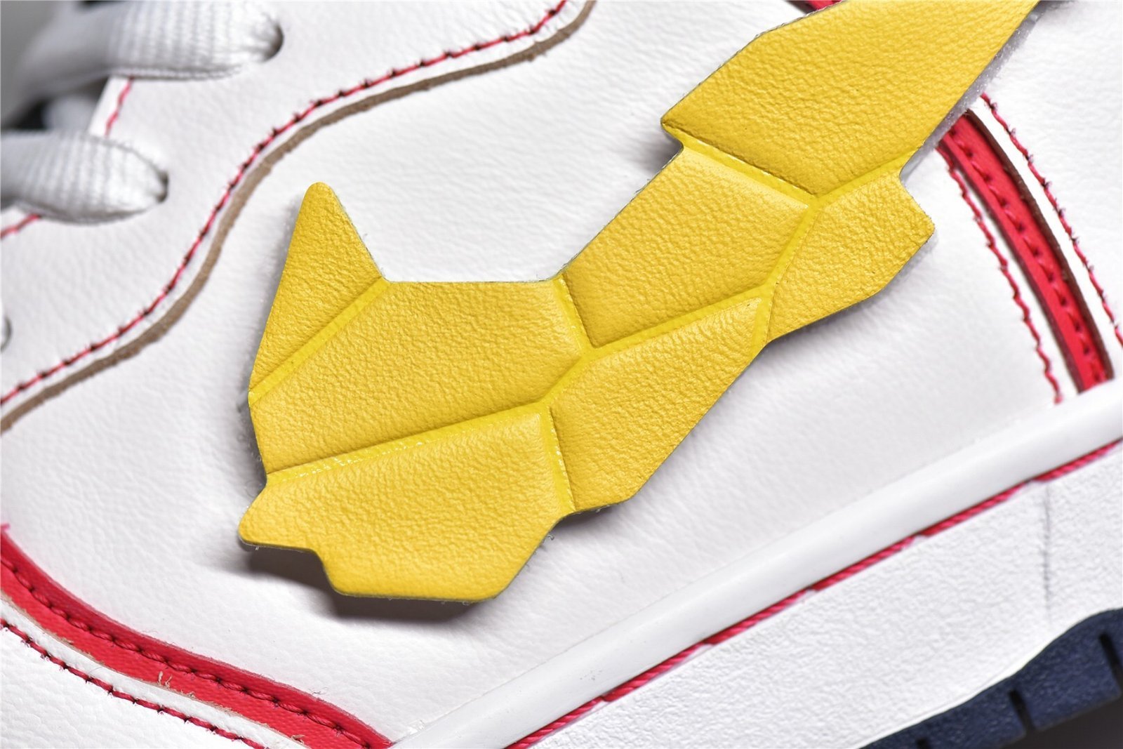 The Dunk SB High RX-0 Unicorn Gundam DH7717-100 features a white leather upper with red and gold accents. inspired by the RX-0 Unicorn Gundam. This sneaker includes removable Swoosh logos. Unicorn Gundam decals. and branding on the heel and tongue. It offers a padded tongue and collar. Zoom Air cushioning. and a durable rubber outsole for comfort and performance.