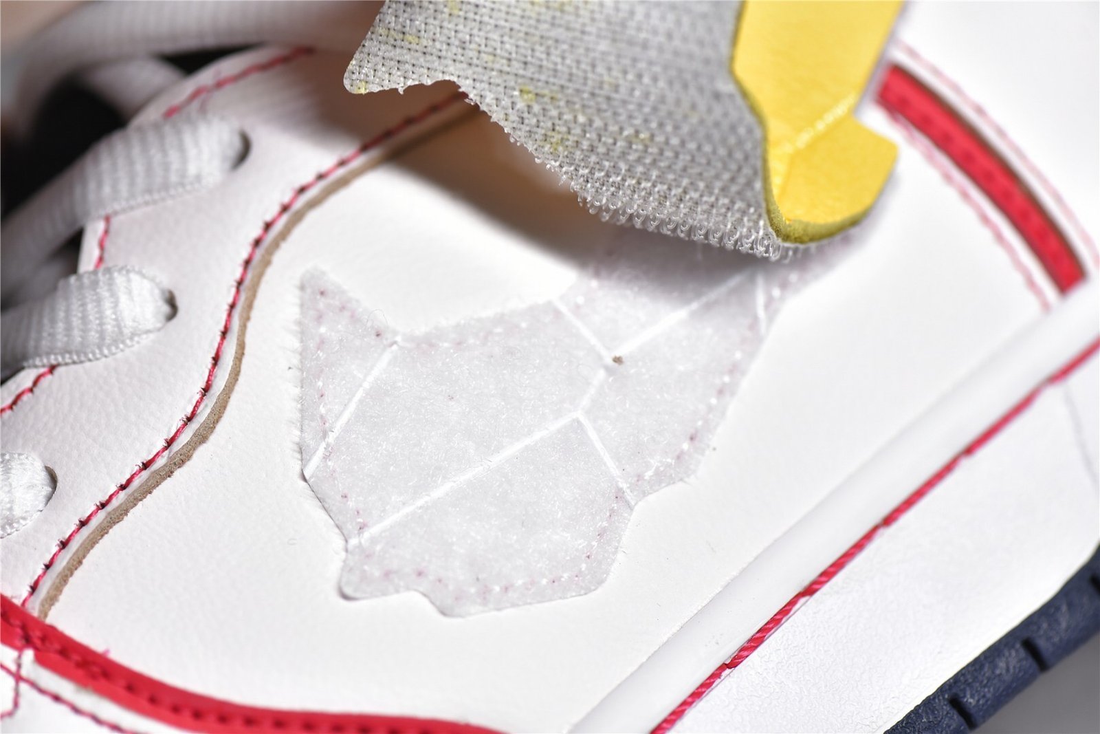 - Design Elements: Inspired by the RX-0 Unicorn Gundam. this sneaker features a predominantly white leather upper with red and gold detailing. The design includes removable Swoosh logos. reflecting the Gundam’s transformable nature. Additional detailing includes Unicorn Gundam decals and branding on the heel and tongue.