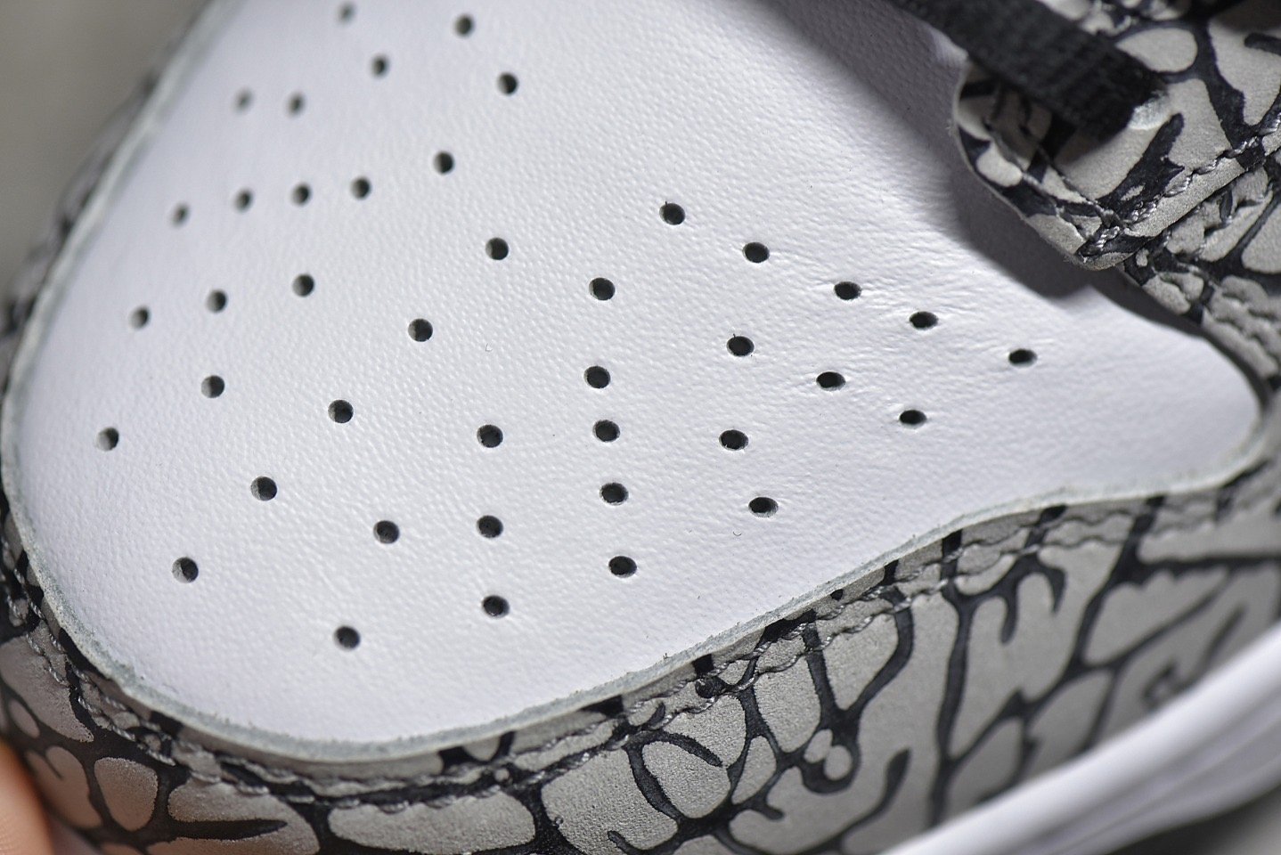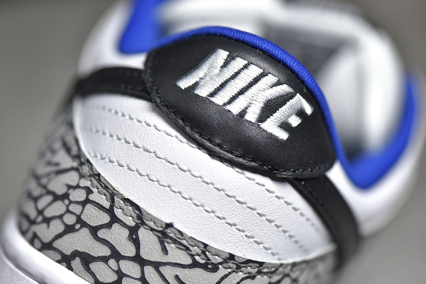 • Design Elements: This sneaker features a white leather upper with black suede overlays. It includes cement print panels on the heel and toe box. reminiscent of the Air Jordan 3 “White Cement.” The Supreme red box logo is prominently displayed on the side heel. along with Nike SB branding on the tongue. The design is completed with a white midsole and red outsole.