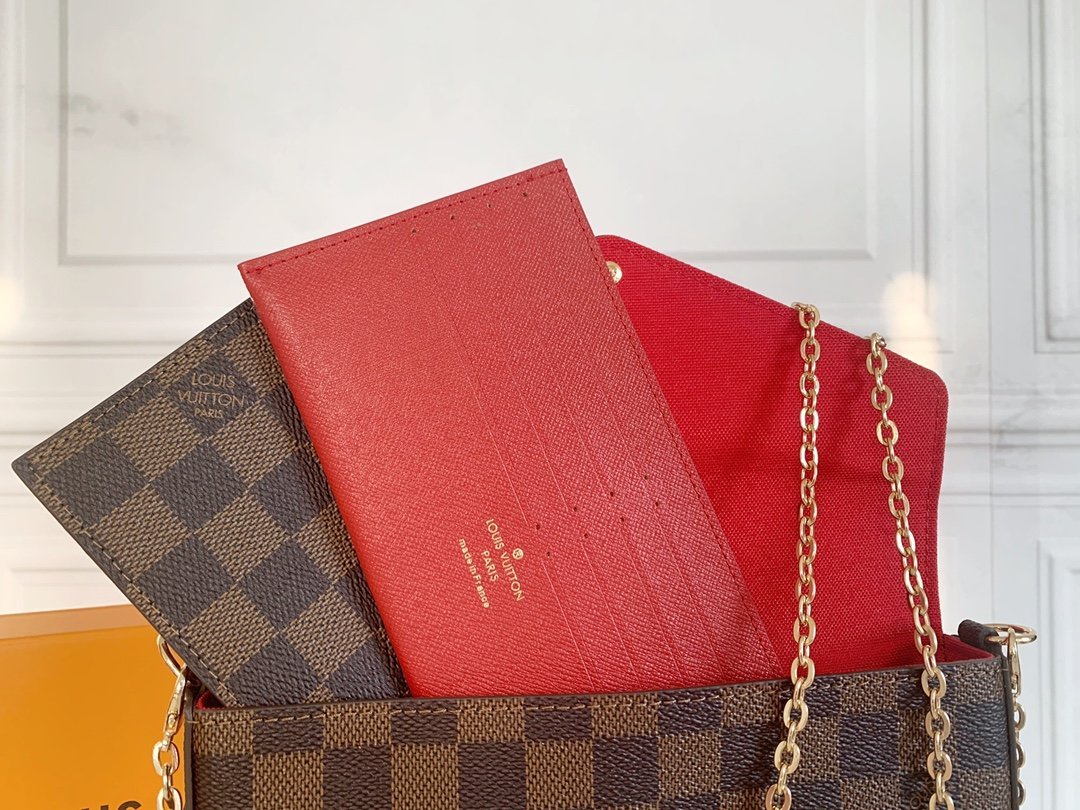 Three-piece set. Model M61276 Felicie handbag is elegant and luxurious. It contains two detachable pockets. It is a fashionable choice for carrying and organizing your everyday items. It is more than just a wallet. After removing the gold chain. it can also be used as a charming handbag or a small handbag. Size 21 * 11 * 2cm