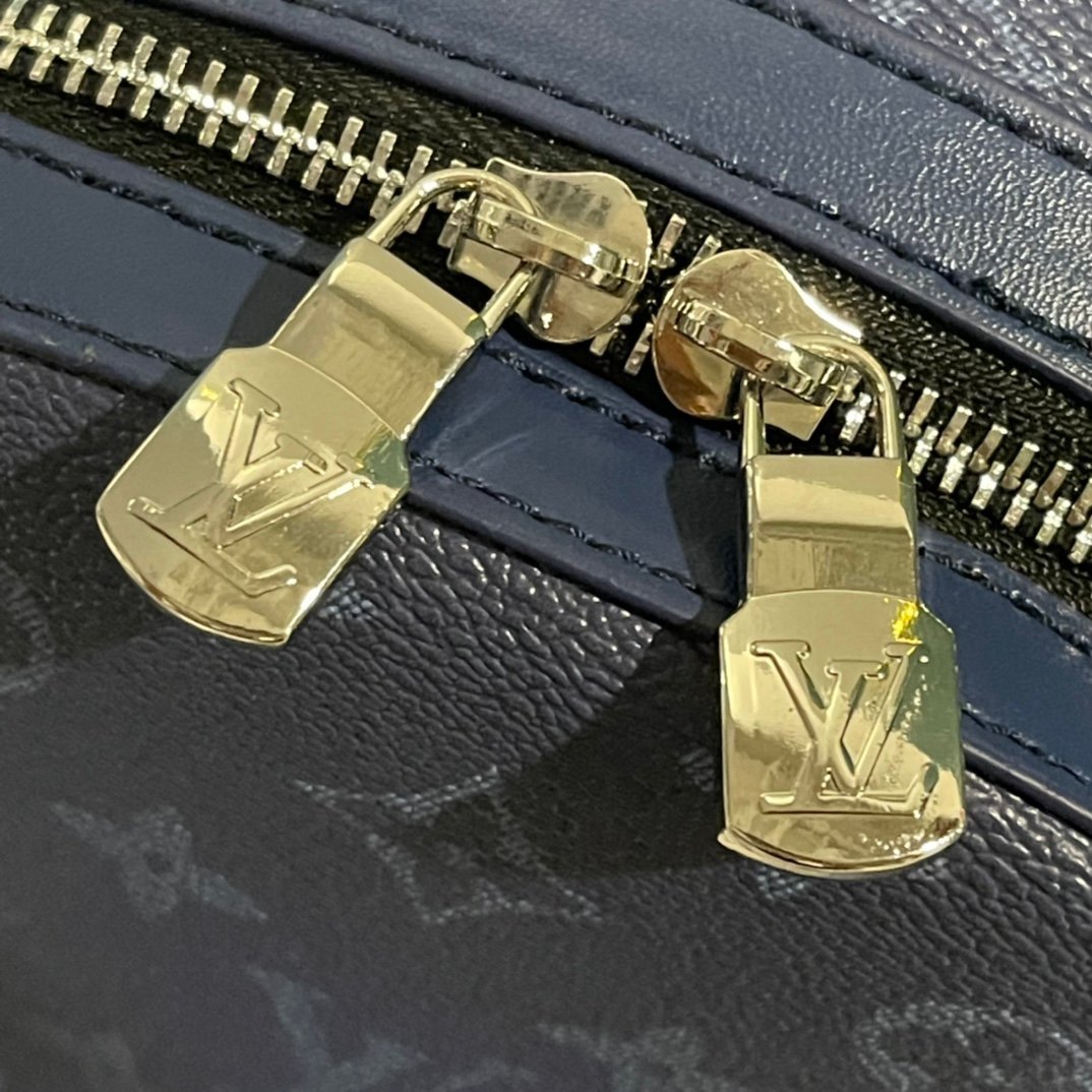 Gradual change blue. the latest Discovery small backpack features deep Monogram Eclipse Reverse coated canvas to create a chic look with the gradual disappearance of Quanfu Monogram patterns. and then imbue the leather label. zipper edge and top handle with bright tones. Zippered front pockets and open side pockets perfect the details for daily carry.