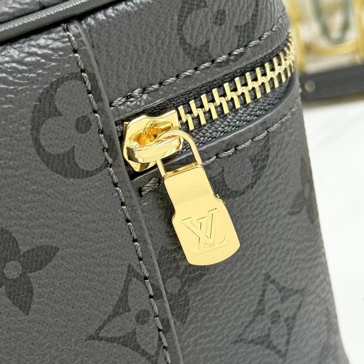 Drawing inspiration from the classic cosmetic case. the handbag interprets the spirit of travel in Monogram canvas. The top handle and removable braided chain blend in with leather elements to complement the concise lines of the bag body. The LV inscribed padlock and leather key bag continue the signature details. 19 x 11.5 x 6.5 cm