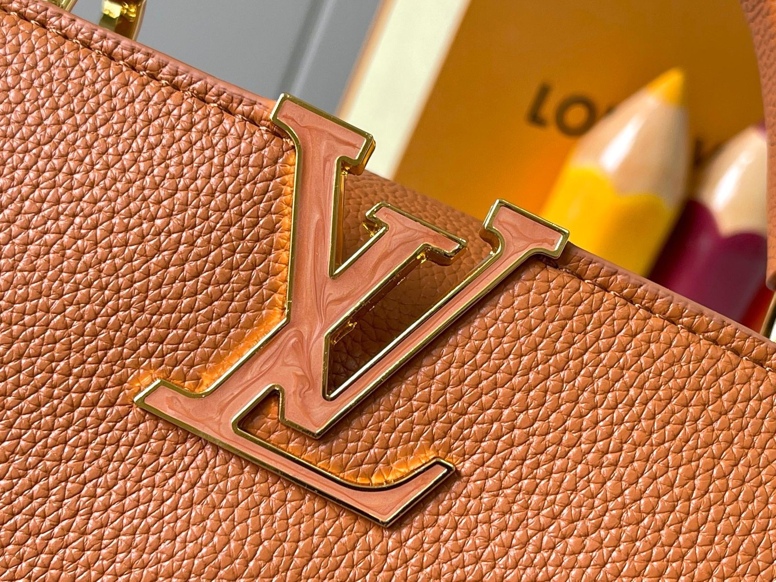 M14971 brown. this CapucinesBB handbag invokes the design elements of the Harmony series. and is inspired by the Monogram flowers with a gorgeous chain. The Taurillon bovine leather bag is embellished with the resin-coated LV logo. and the flap that can be opened externally or inwardly is now a neat inner layer with multiple pockets.