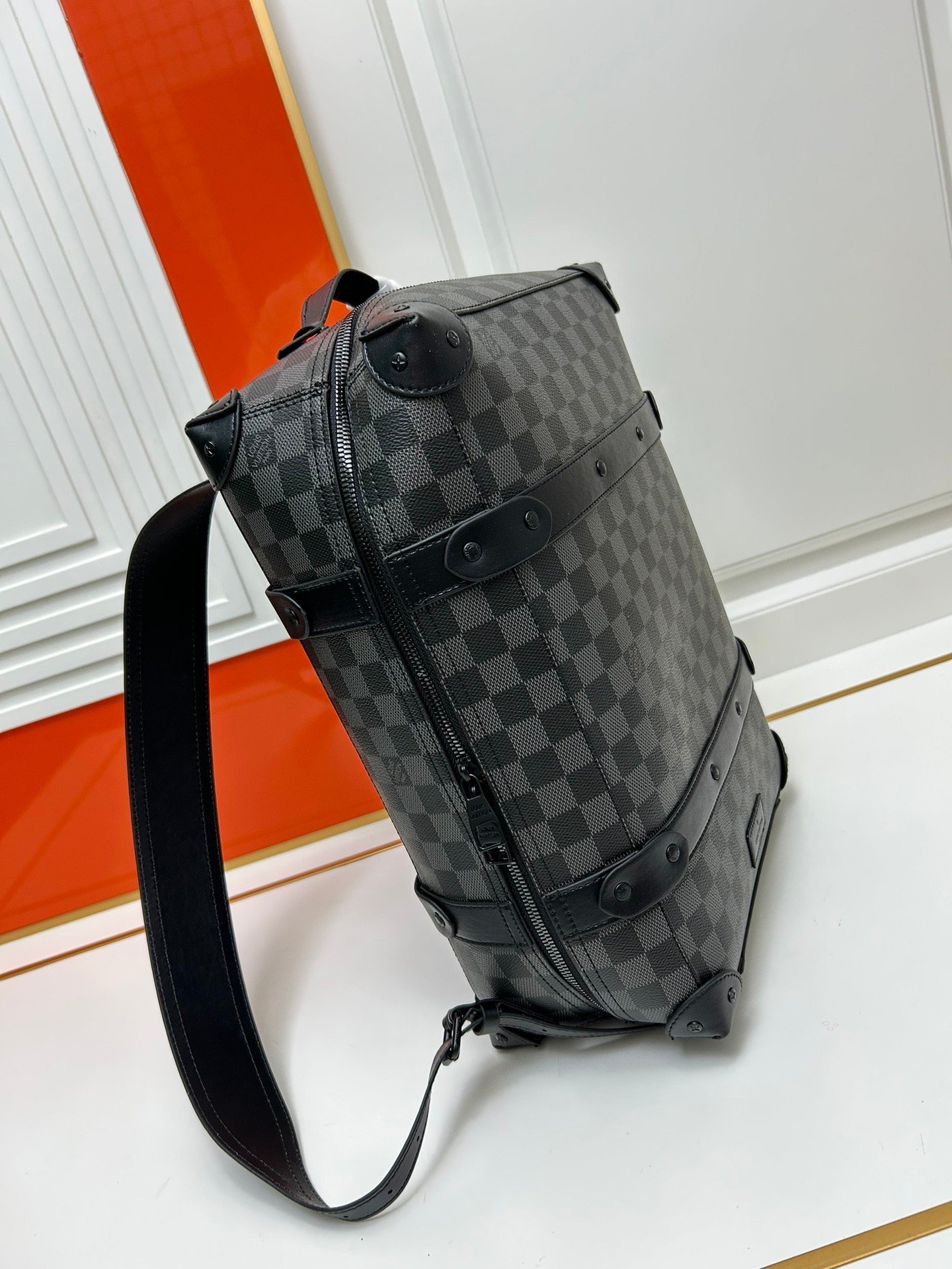 Retro trunk bag 44752 with LV’s classic and refined trunk bag. fabric lining. aged gold metal parts. full Monogram pattern. Zipper closure and adjustable leather shoulder strap. Size: 36*28*14cm.