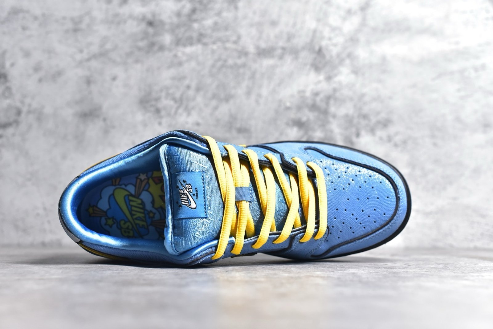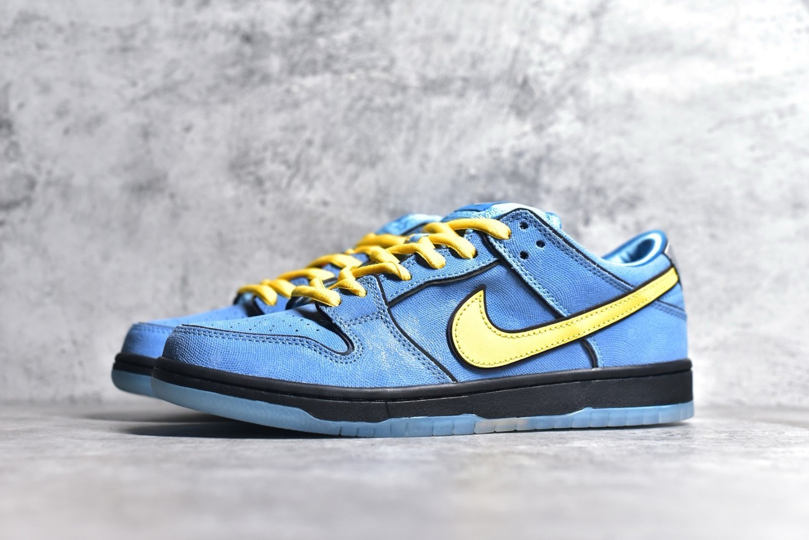The NK SB Dunk Low Bubbles The Powerpuff Girls FZ8320-400 features a vibrant blue colorway and themed details celebrating Bubbles from the animated series. Ideal for fans looking to add a playful touch to their sneaker collection.