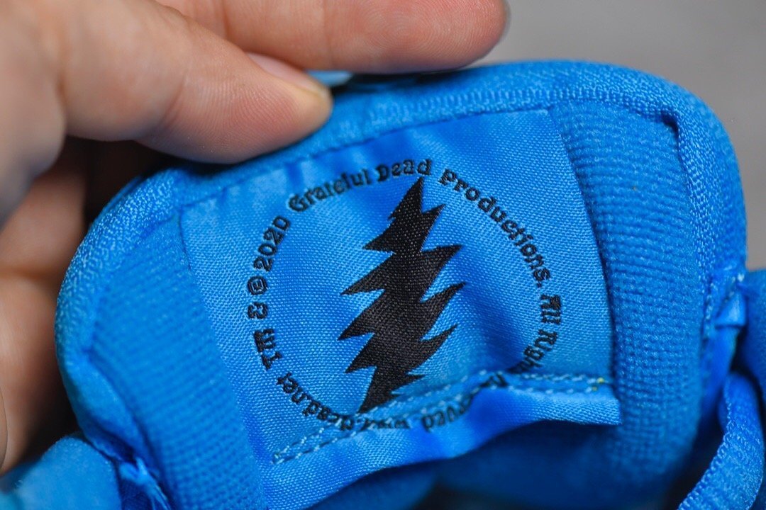 • Colorway: Predominantly blue upper with colorful accents. reflecting the Grateful Dead’s dancing bears motif.