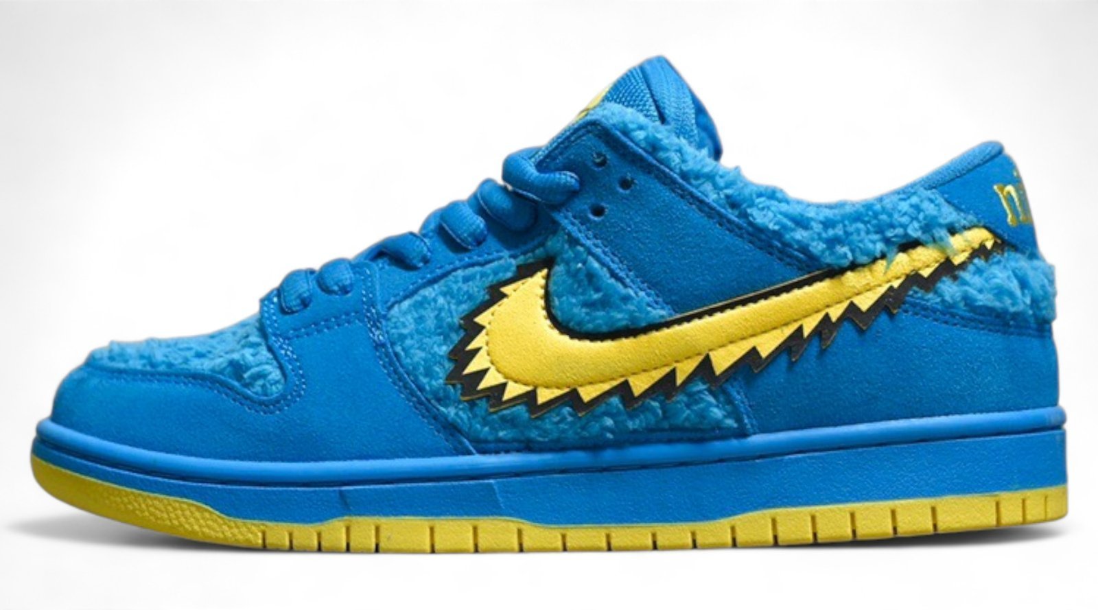 The SB Dunk Low Grateful Dead Bears Blue features a vibrant blue colorway. fuzzy suede and faux fur materials. iconic Grateful Dead branding. comfortable fit with padded collar and tongue. responsive Zoom Air cushioning. and a durable rubber outsole. It’s a must-have for sneaker enthusiasts and fans of the Grateful Dead looking to add a unique and expressive shoe to their collection.