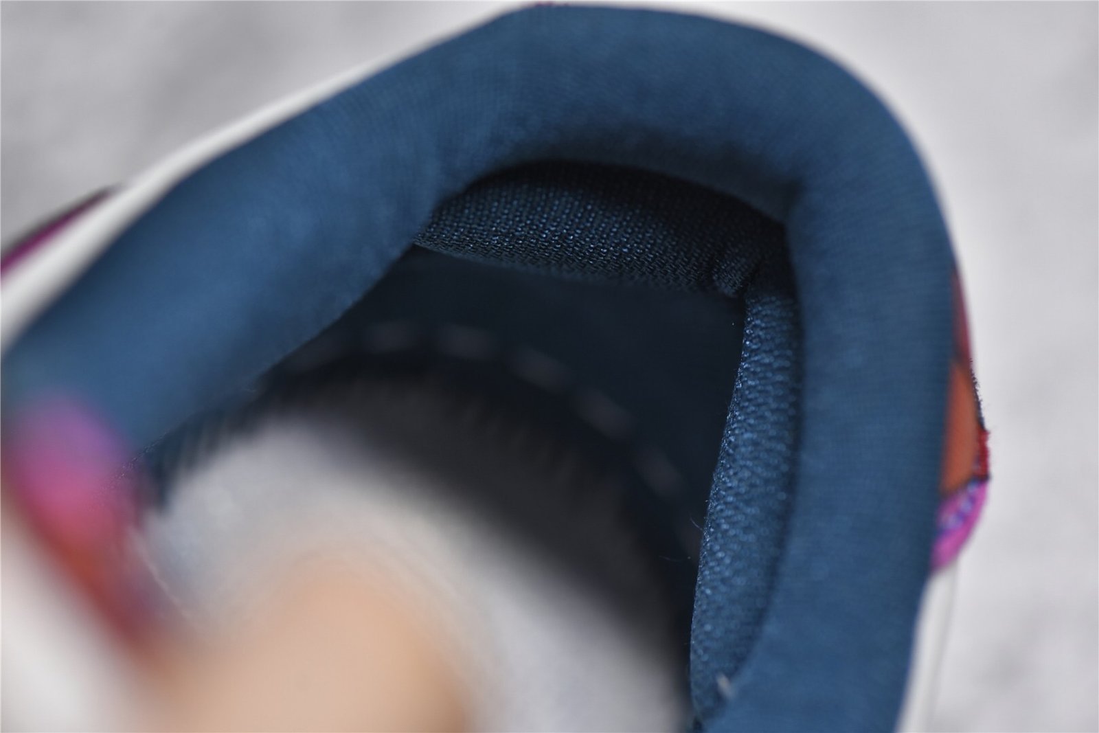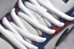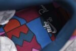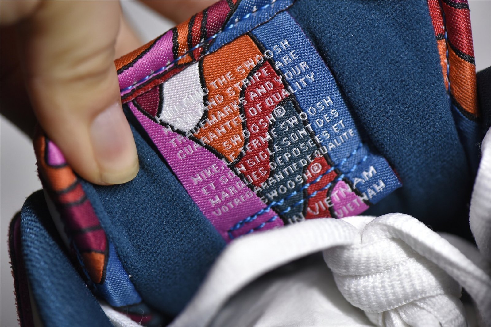 - Design Elements: Features an abstract art pattern by Piet Parra. covering the overlays in shades of blue. red. pink. and orange. The base is white leather. and the Swoosh is black. providing a sharp contrast. Unique Parra branding is present on the tongue tag. insole. and heel.