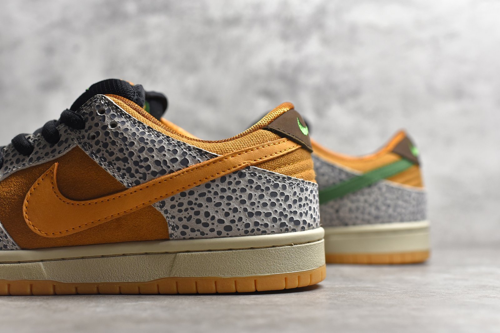 - Colorway: Predominantly black upper with orange and green accents. featuring the classic Safari print on overlays.