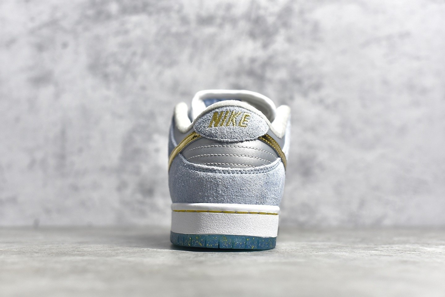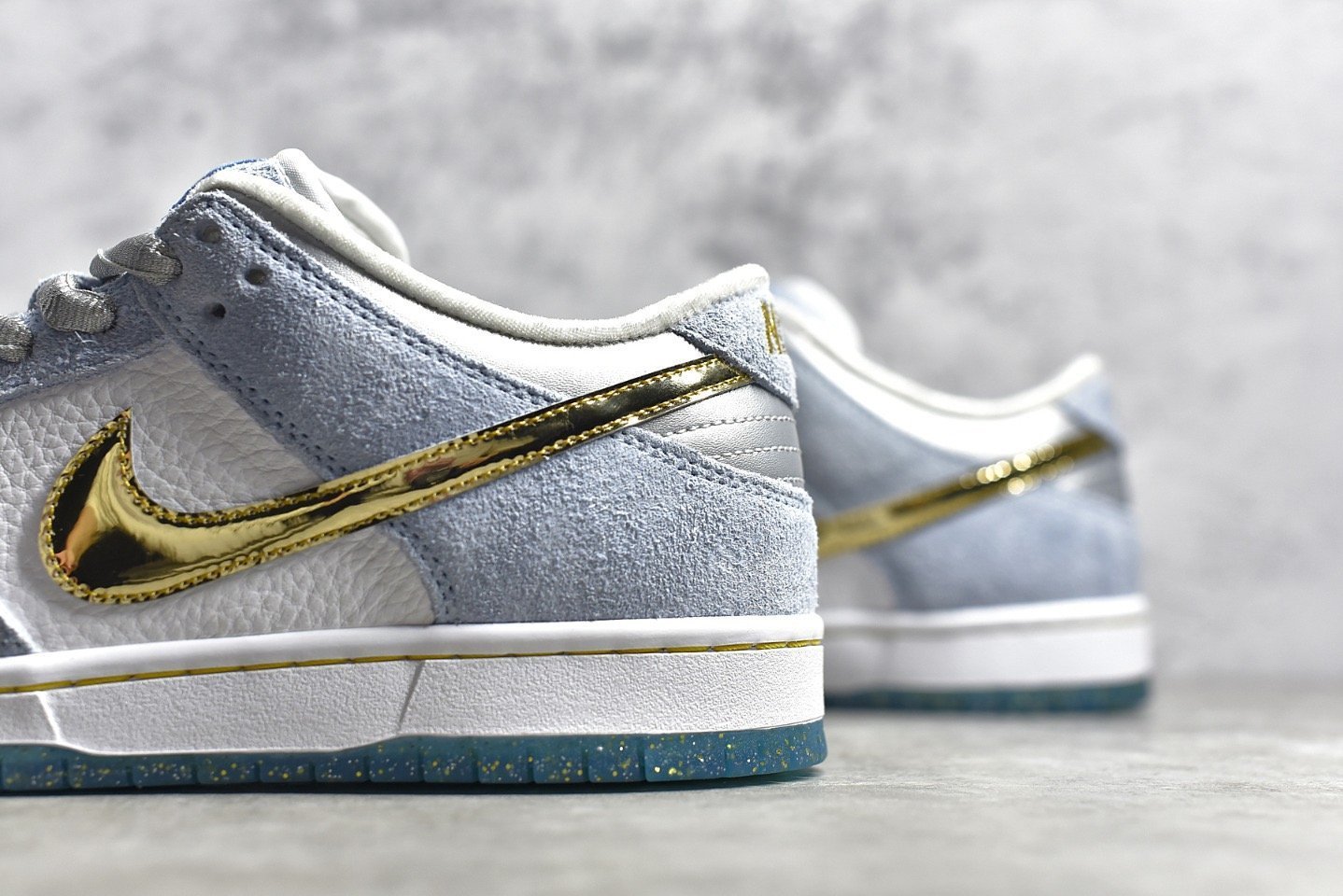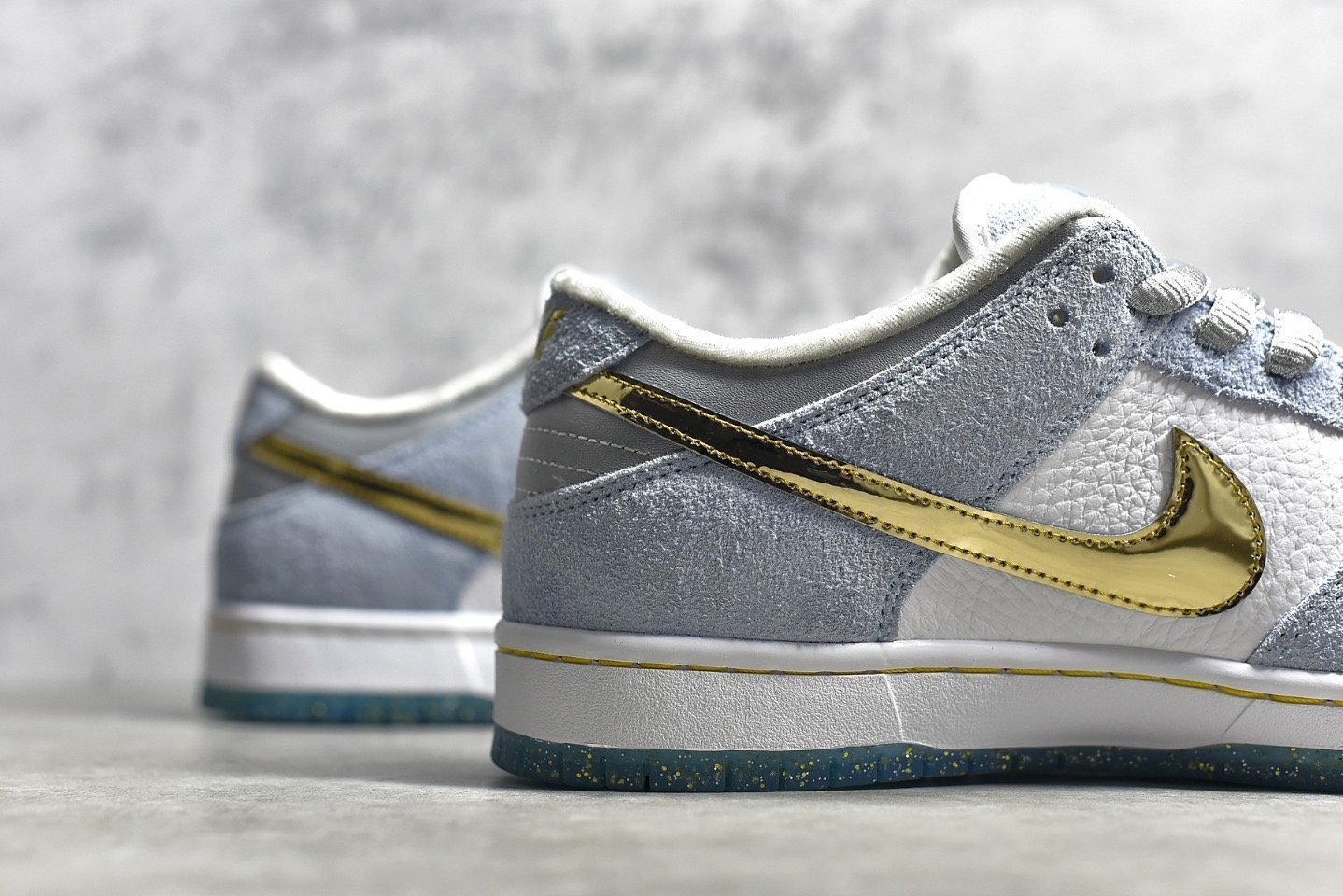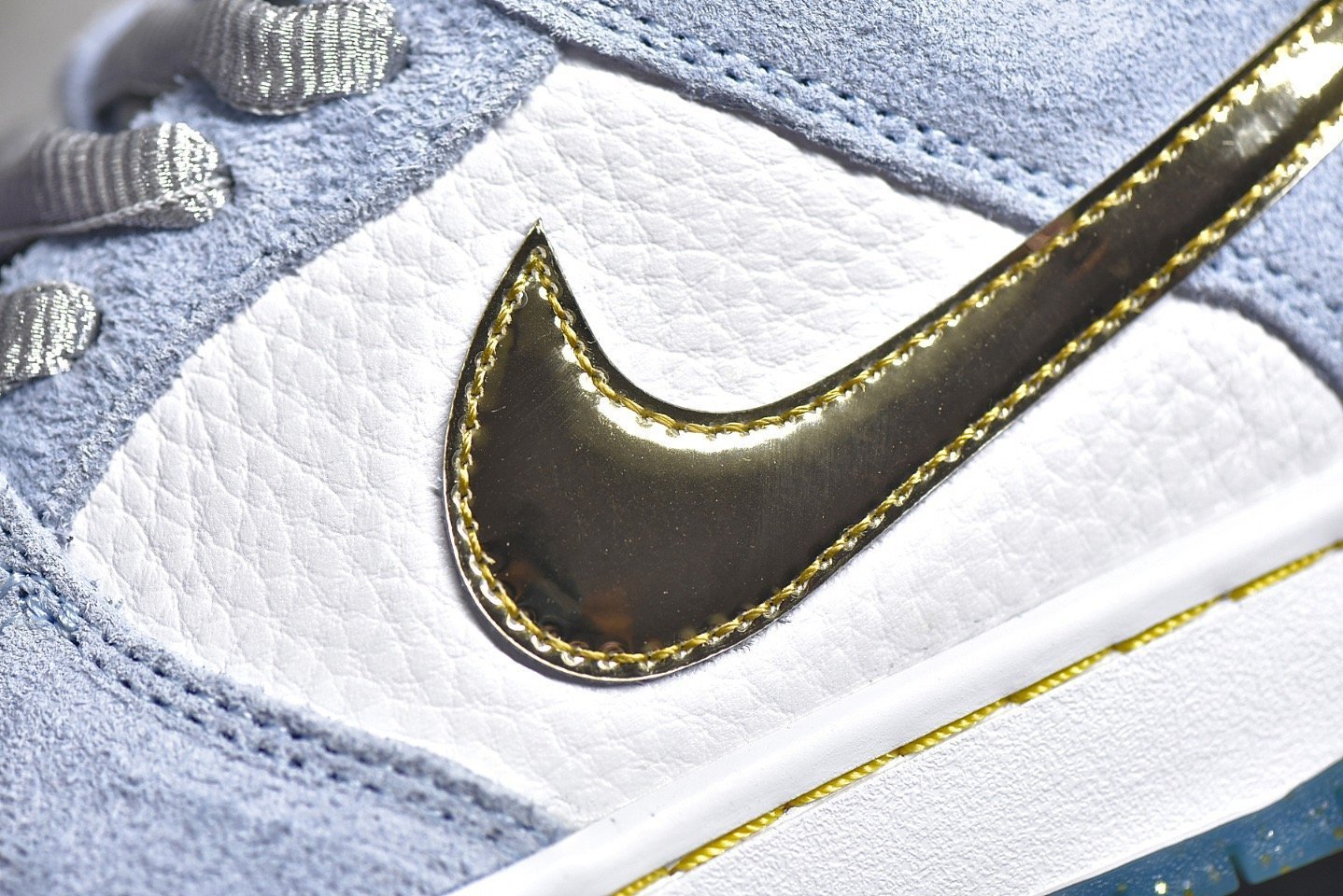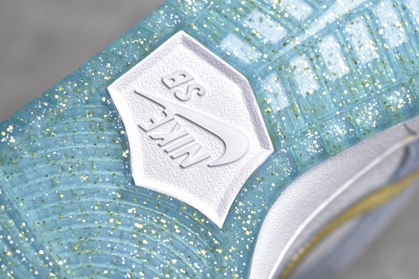 - Design Elements: This sneaker features a white. blue. and metallic gold colorway with intricate details. It includes special graphics on the insoles and glittery gold accents. The icy blue outsole adds a unique touch. making it stand out.