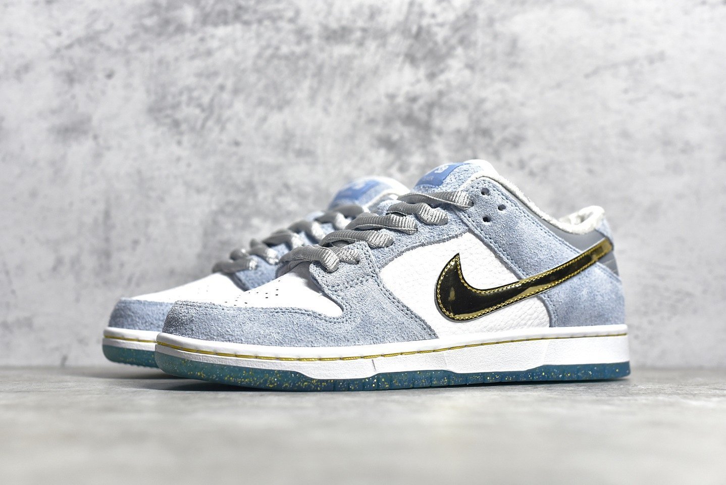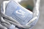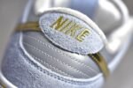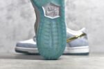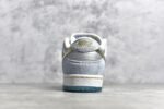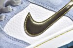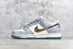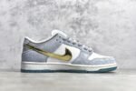 The SB Dunk Low Sean Cliver DC9936-100 features a white. blue. and metallic gold colorway with intricate design elements. This sneaker includes special graphics on the insoles. glittery gold accents. and an icy blue outsole. It offers a padded tongue and collar. Zoom Air cushioning. and a durable rubber outsole for comfort and performance.