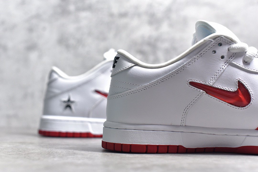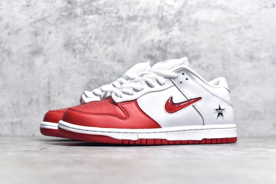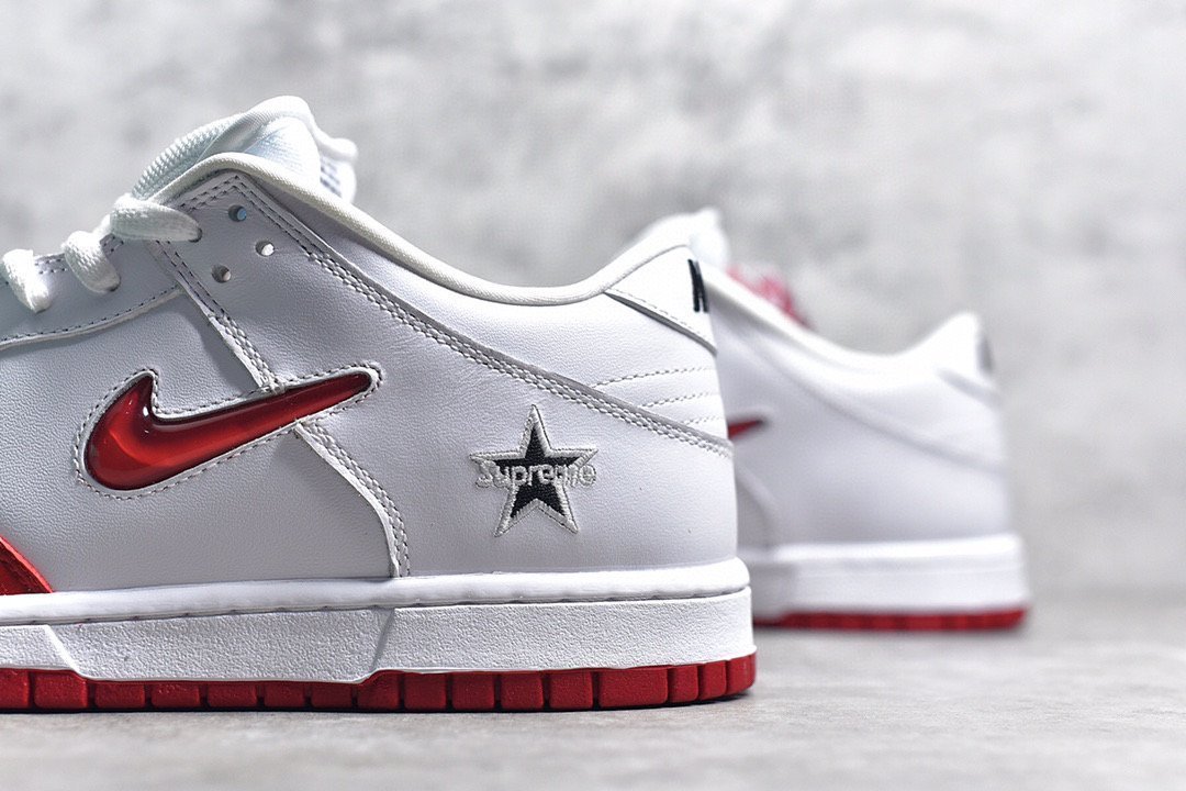 The SB Dunk Low Supreme Jewel Swoosh Red CK3480-600 is a collaboration between Nike and Supreme. featuring a striking design and premium materials. Here are the typical features of this shoe: