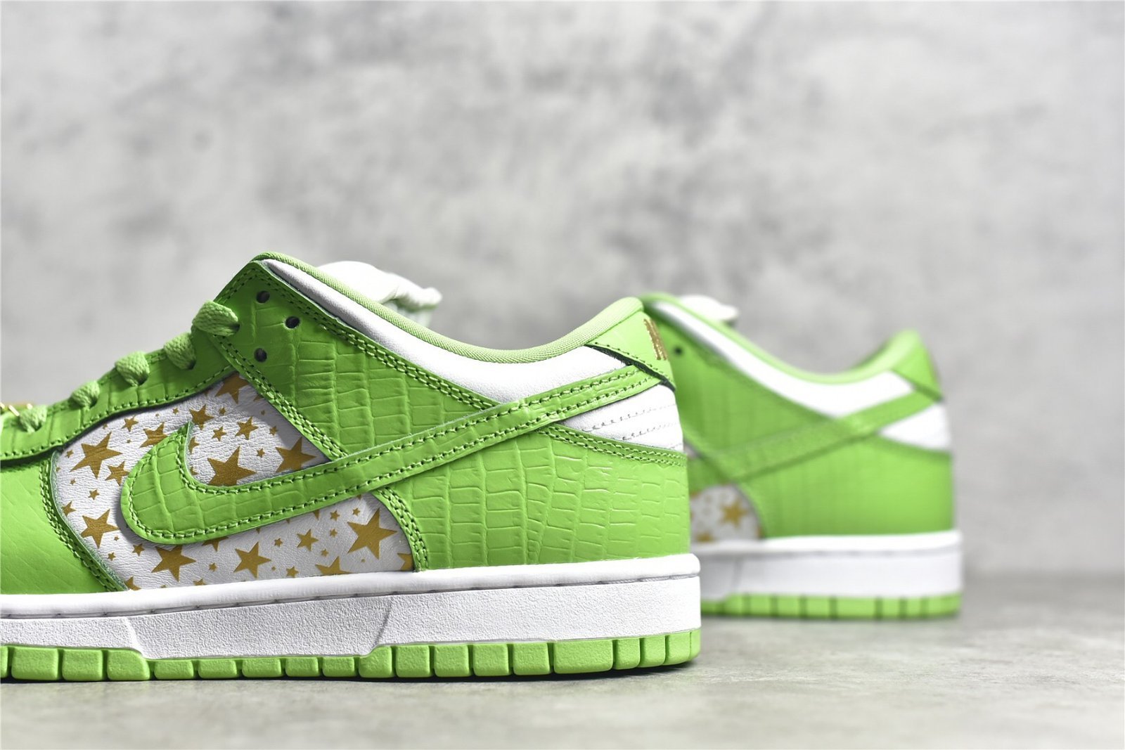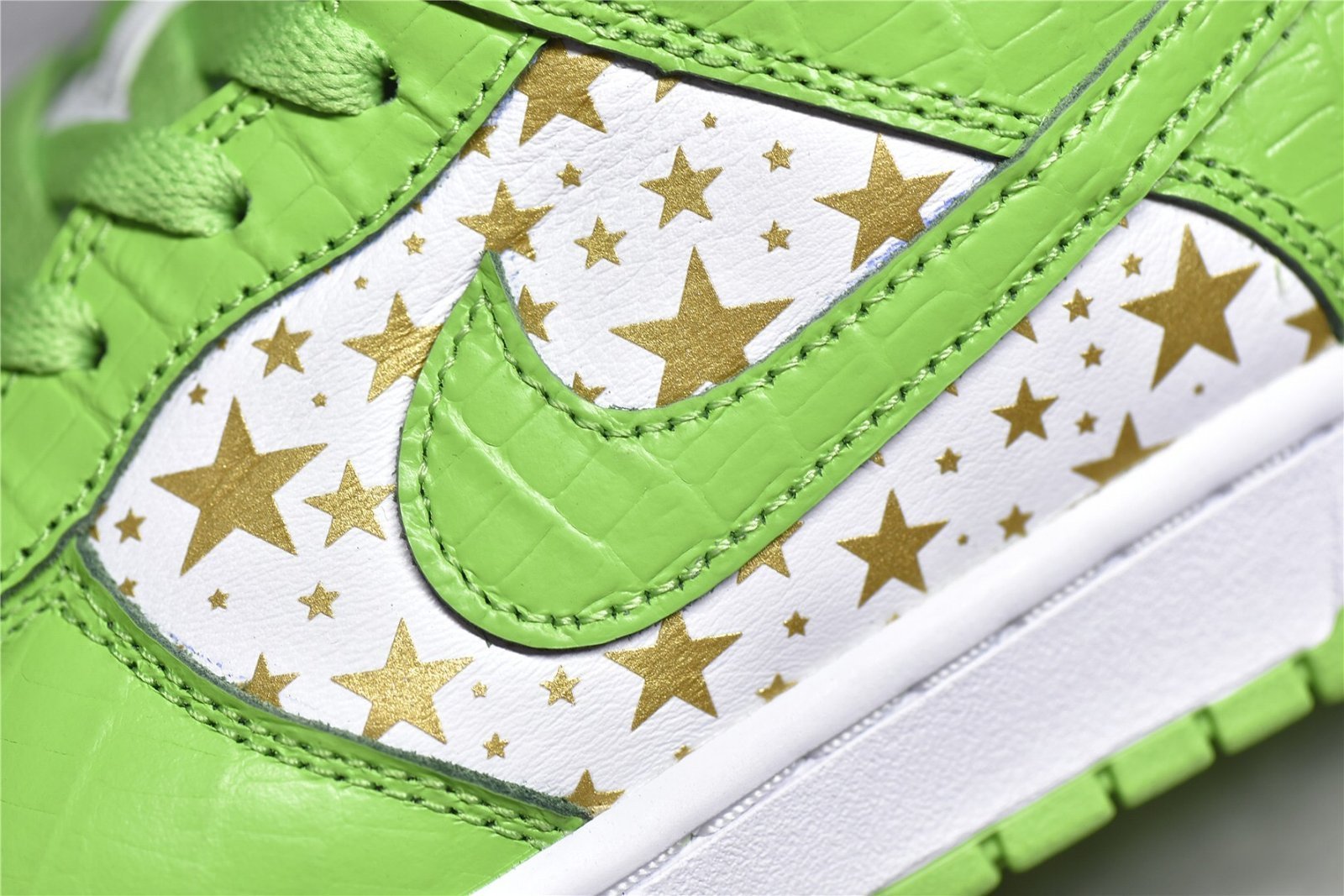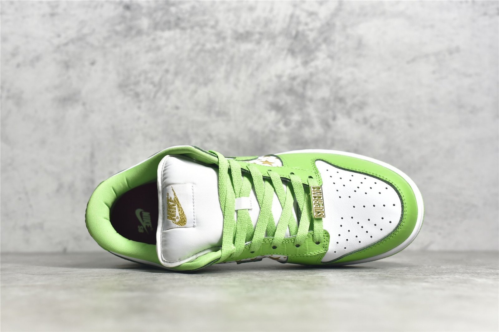 - Design Elements: Features a striking Mean Green base with black overlays. The shoe is adorned with small white stars all over the upper. giving it a unique and playful aesthetic. Supreme branding is subtly incorporated on the tongue tag and insoles. while Nike branding appears on the heel tab.