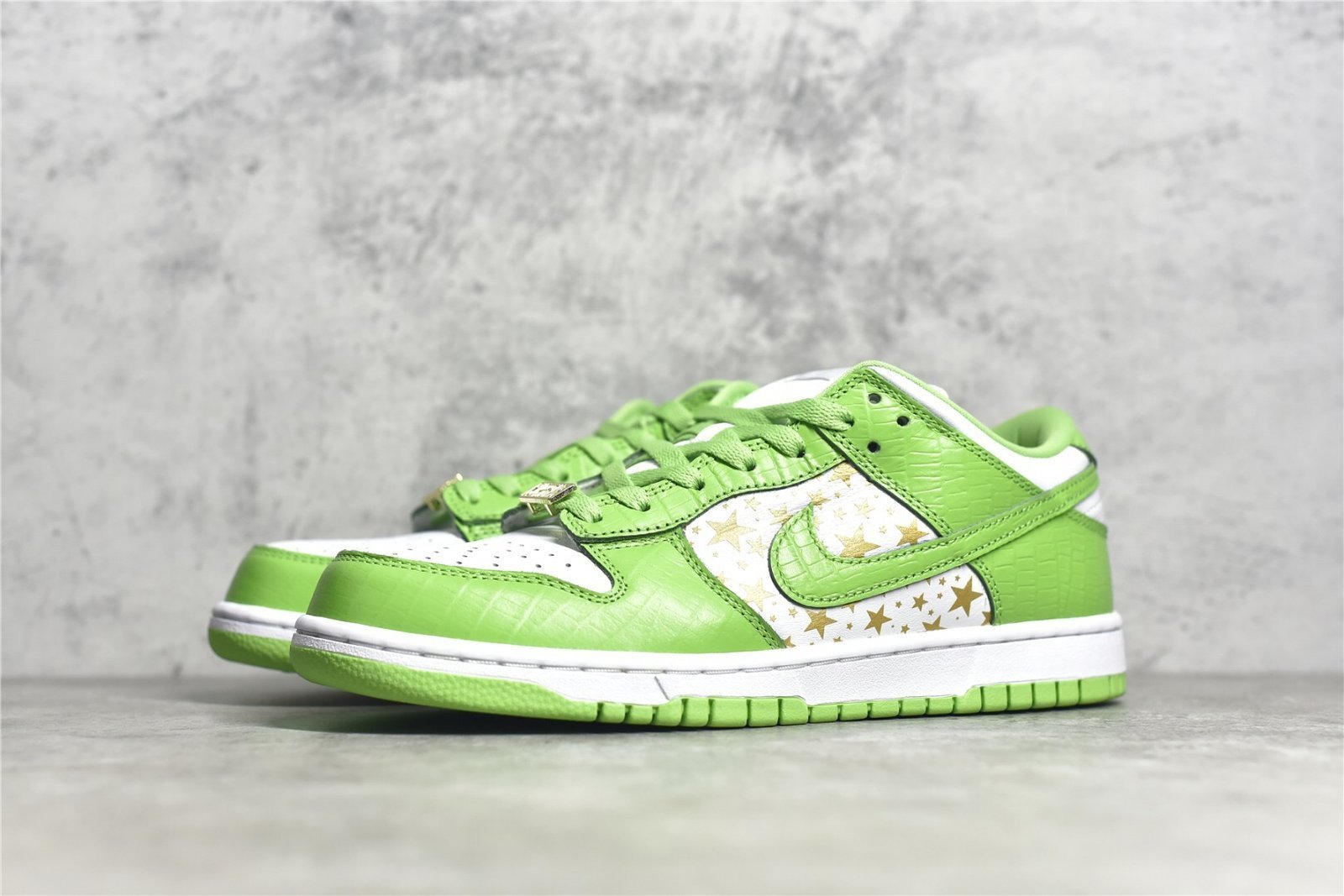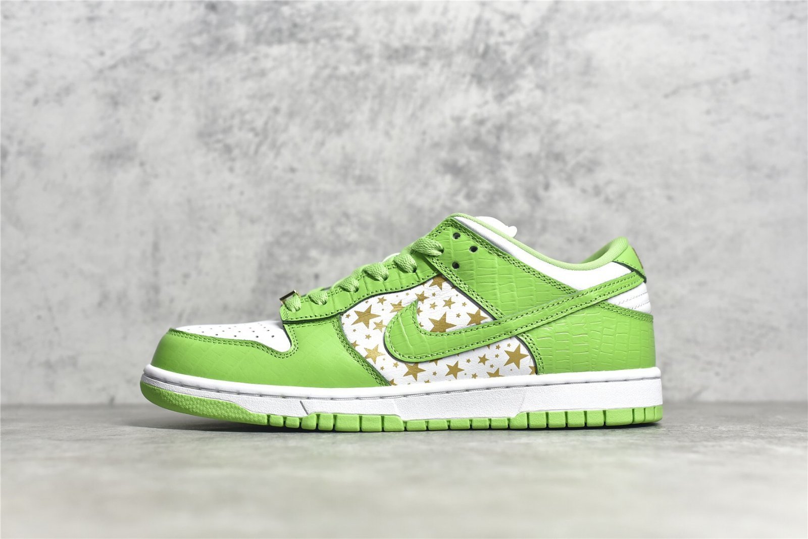 The SB Dunk Low Supreme Stars Mean Green is a stylish and eye-catching sneaker from Nike’s collaboration with Supreme. Here are the typical features of this shoe: